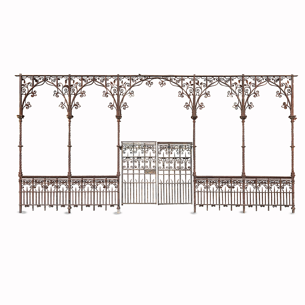 EARLY VICTORIAN CHURCH ROOD SCREEN ORNATE WROUGHT IRON WITH TWIN ARCHED SIDES A CENTRAL ARCH AND GATE 258 CM HIGH 534 CM WIDE