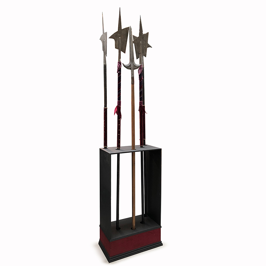 EBONISED HALBERD STAND WITH CLARET RED VELVET BASE 110 CM HIGH 60 CM WIDE 33 CM DEEP (X2) (HALBERDS NOT INC.)