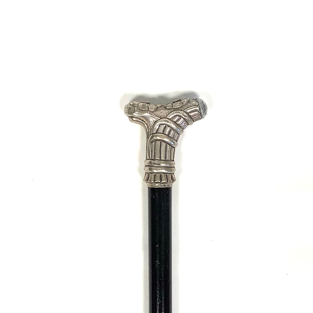 EBONY WALKING STICK / CANE WITH DECORATIVE ART NOUVEAU T-SHAPED SILVER HANDLE AND PASTE STONE 90 CM LONG
