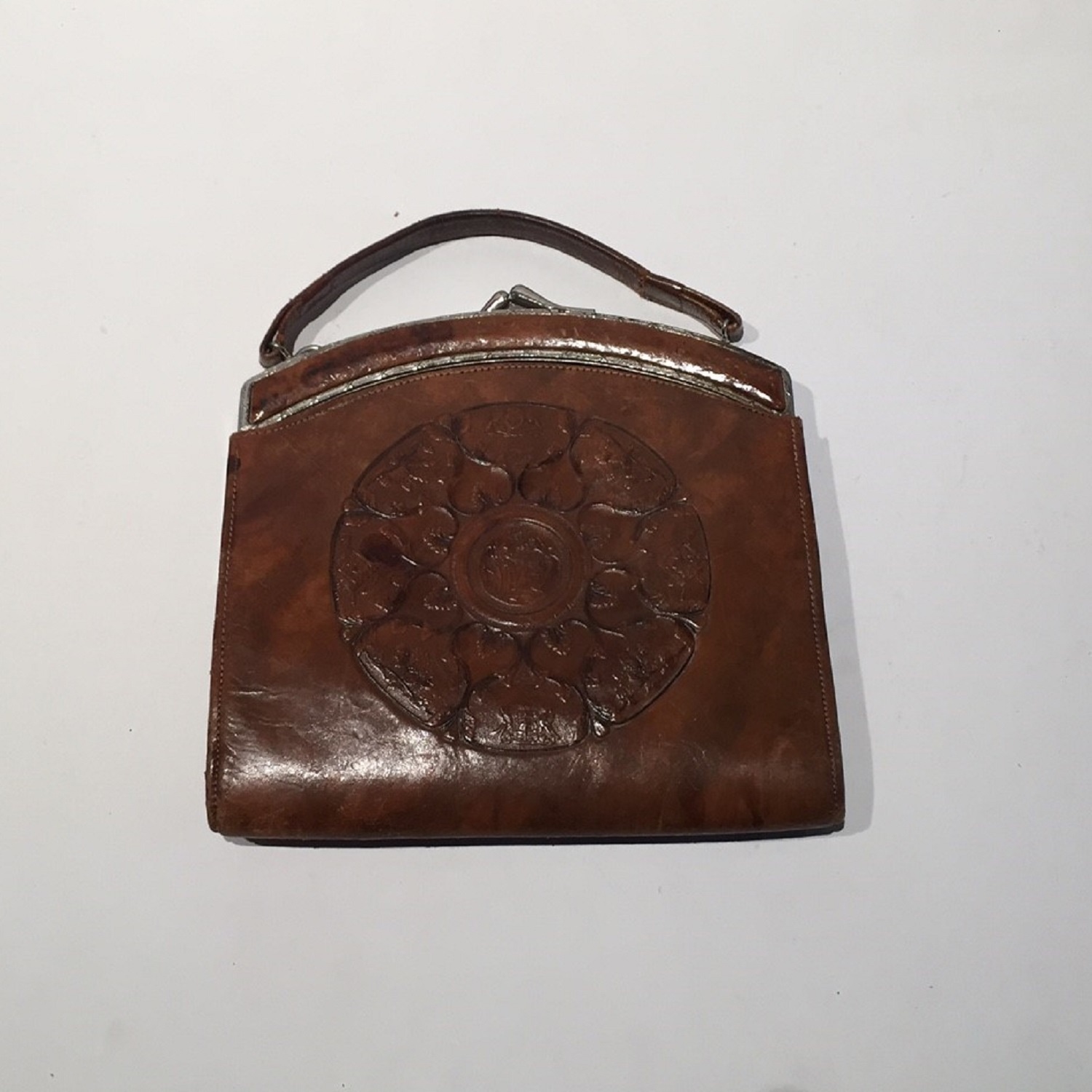 EDWARDIAN BROWN LEATHER HANDBAG WITH LARGE EMBOSSED DESIGN WITH FLORAL AND ROYAL CREST