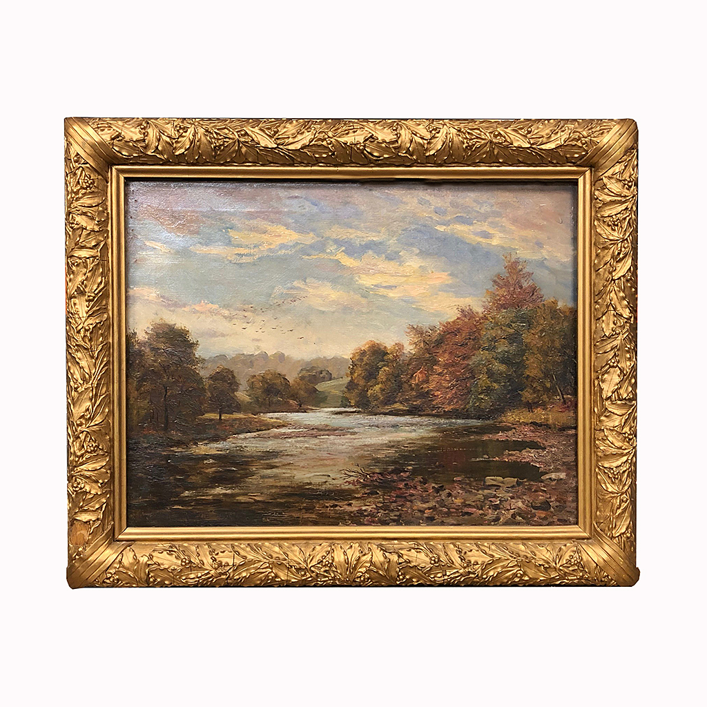 EDWARDIAN ENGLISH LANDSCAPE OIL PAINTING A RIVER SCENE IN PARKLAND WITH A 3" ORNATE GILT GESSO FRAME 20" X 36"