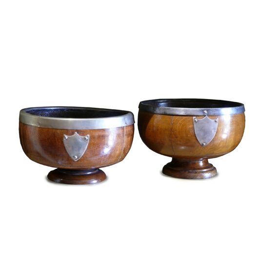 EDWARDIAN OAK BOWL WITH A SILVER RIM AND SHIELD SHAPE PLAQUE 15 CM HIGH 23 CM DIAM