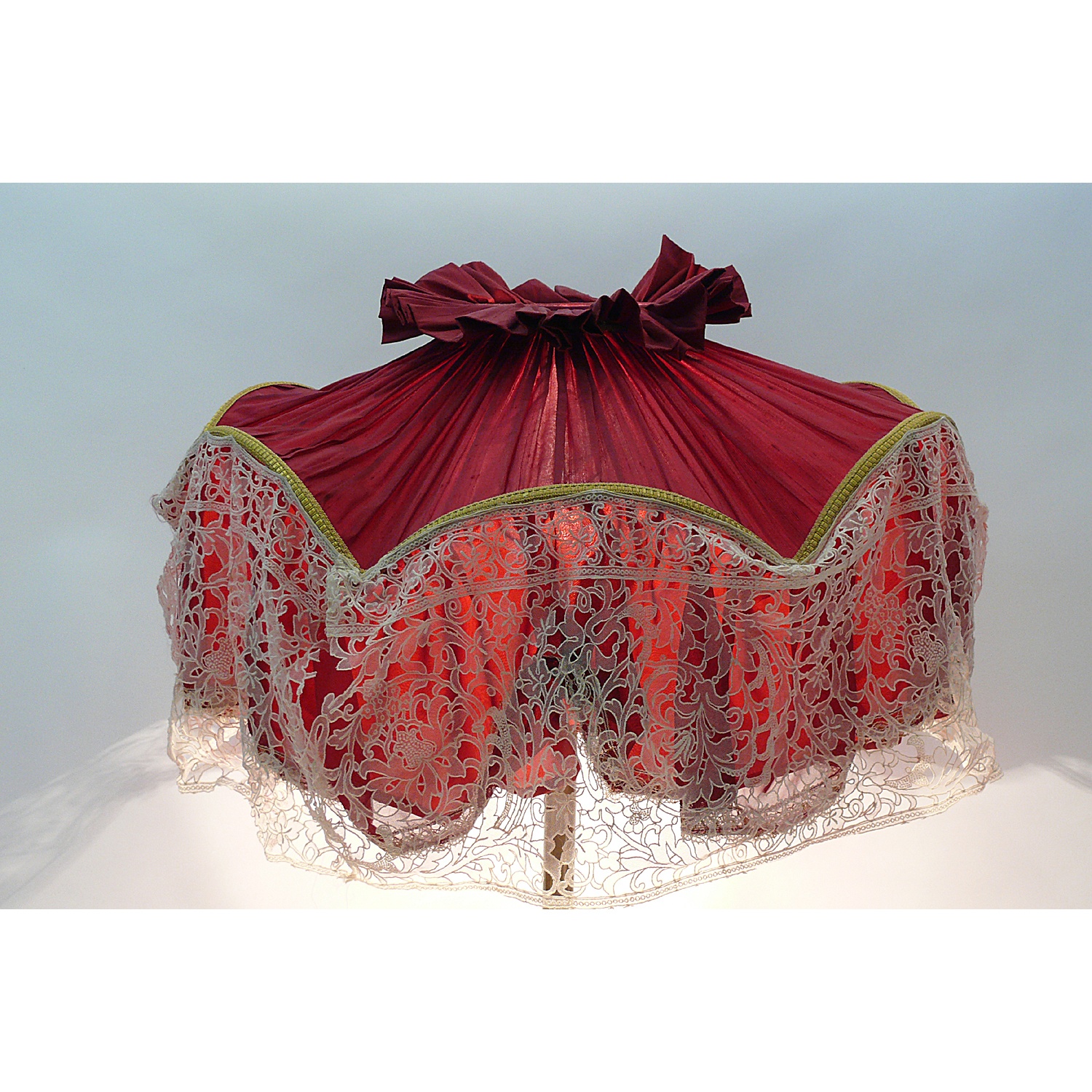 EDWARDIAN STYLE LAMPSHADE BURGUNDY SILK WITH LACE TRIM 62 CM DIAM. (X2)