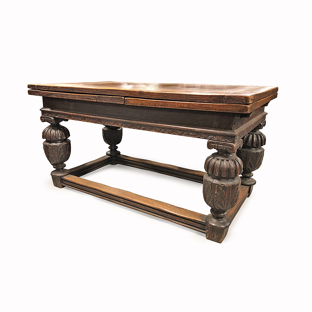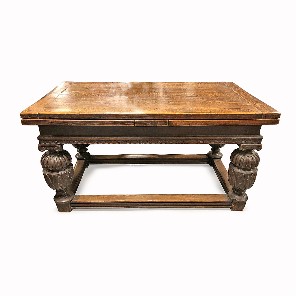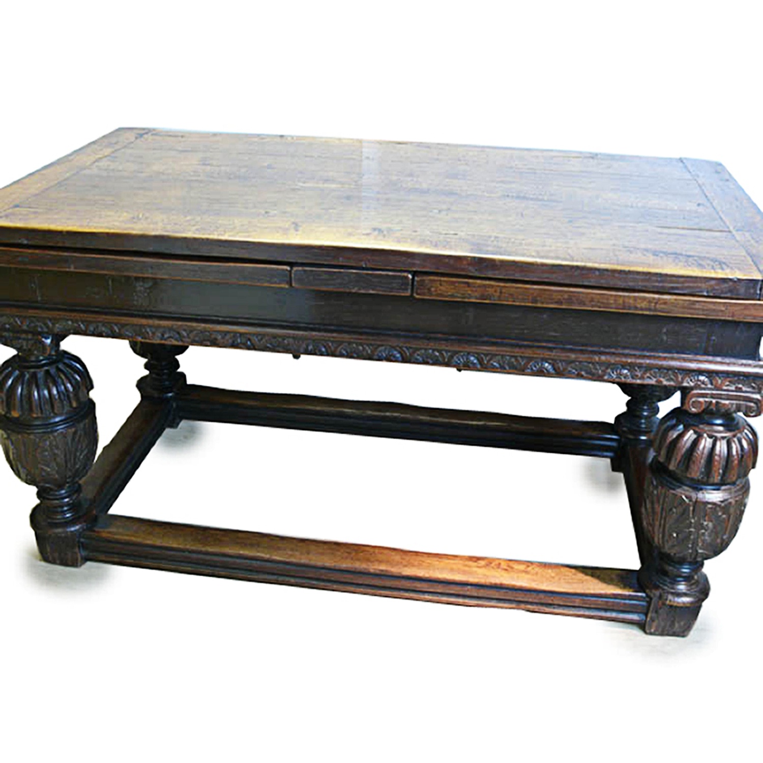 ELIZABETHAN STYLE REFECTORY TABLE DRAWER LEAF CARVED OAK BALUSTER LEGS AND STRETCHERS 151 CM LONG 280 CM EXTENDED 85 CM WIDE 79 CM HIGH