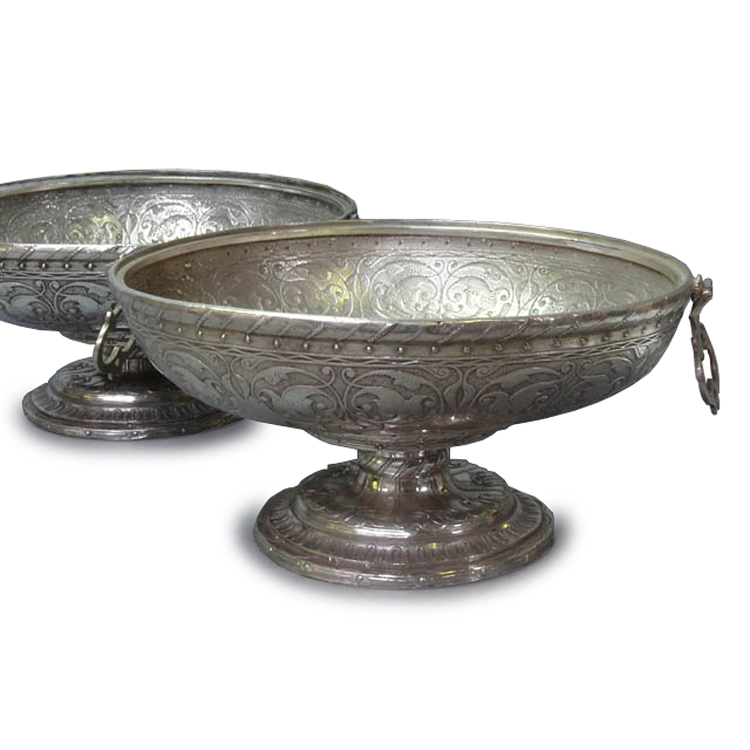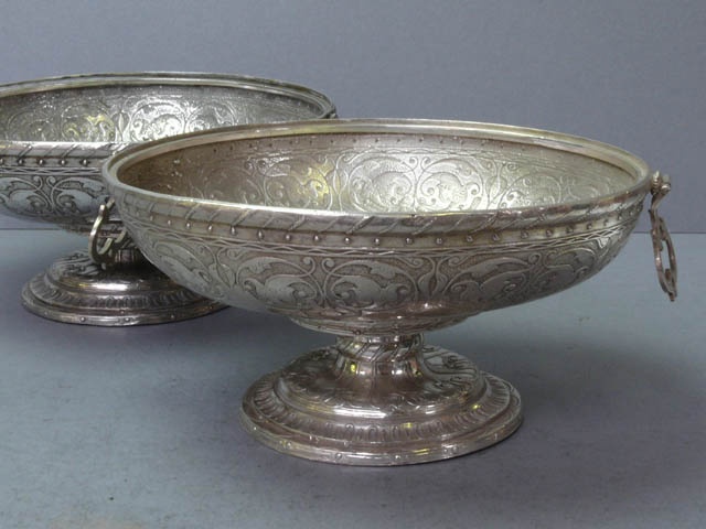 ELKINGTON SMALL SILVER SHALLOW BOWL ON STEM FLORENTINE RELEIF PAT. WITH RING HANDLES
