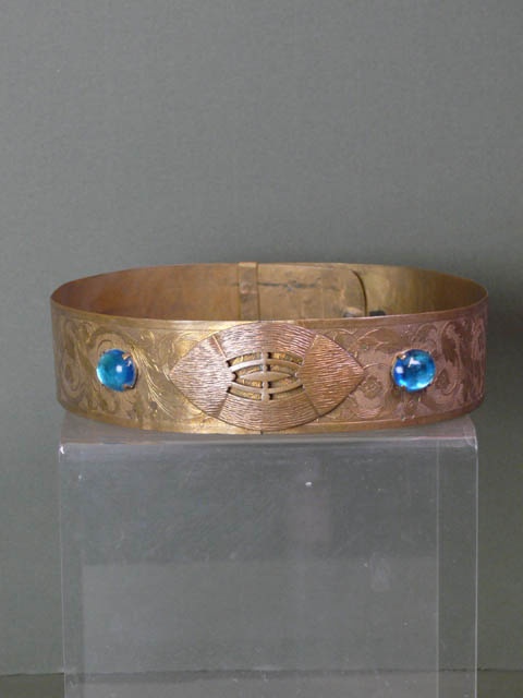 EMBOSSED GILT METAL HEADBAND / CROWN WITH BLUE GEM STONES