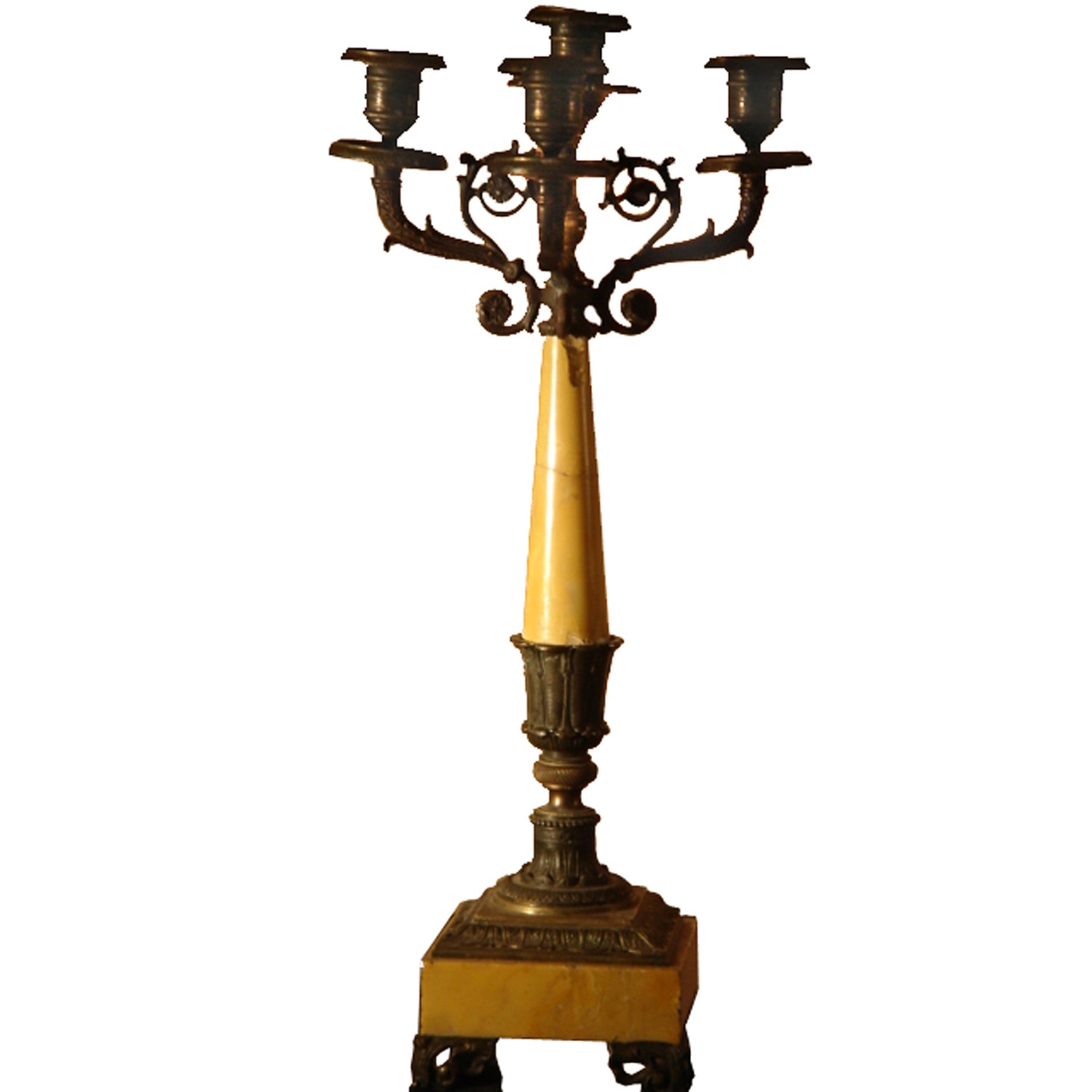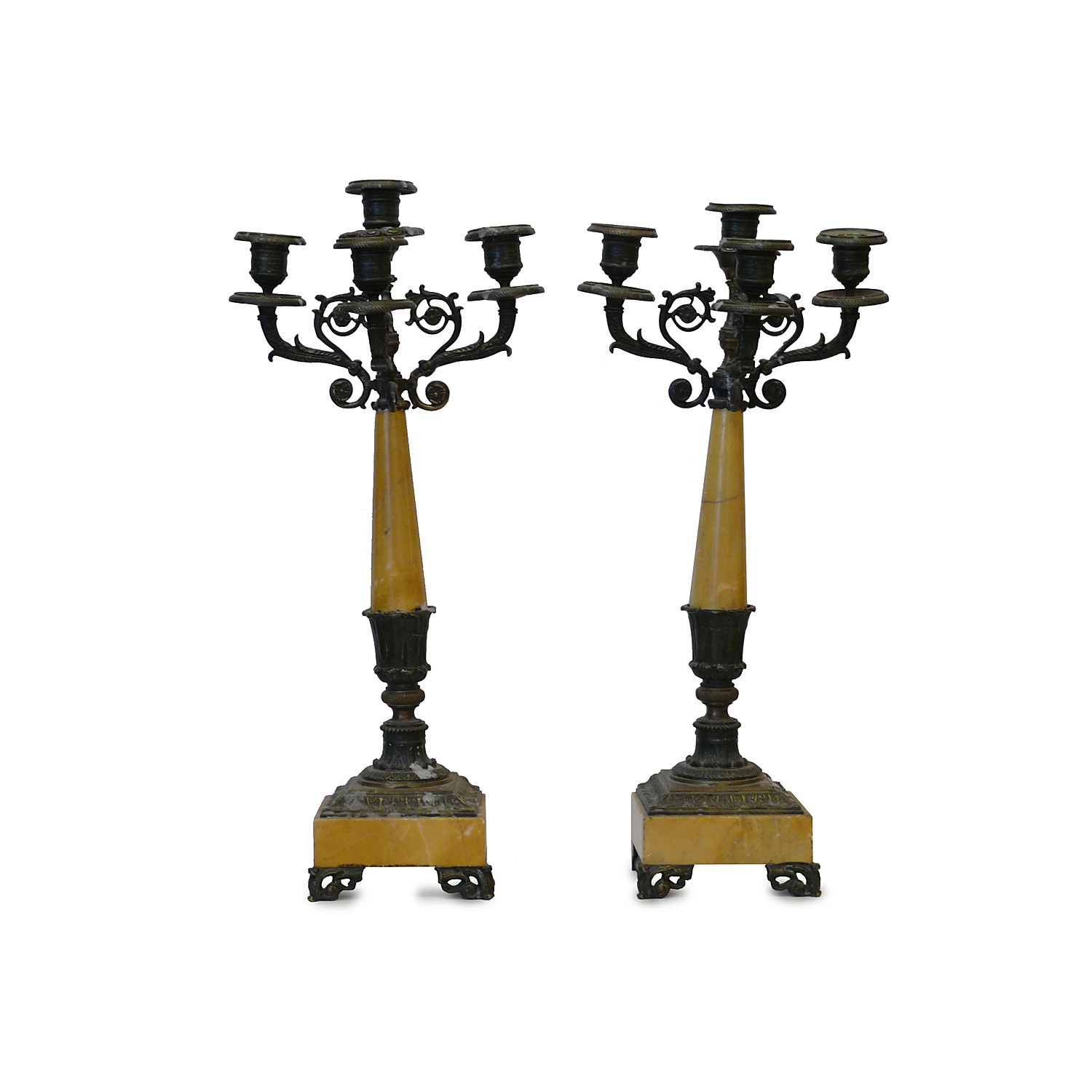EMPIRE AMBER MARBLE AND BRONZE CANDELABRA FOUR LIGHT 53 CM HIGH 23 CM WIDE (X2)