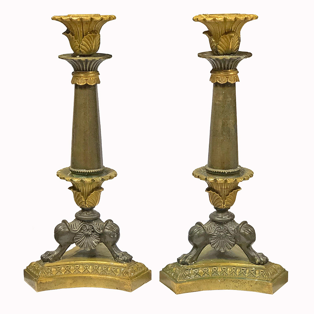 EMPIRE BRONZE AND ORMOLU CANDLESTICK WITH TRICORN GRIFFIN LEG BASE 28 CM HIGH 15 CM WIDE (X2)