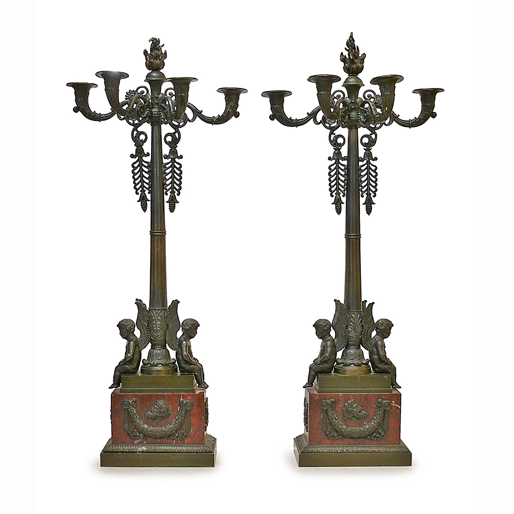 EMPIRE BRONZE CHERUB CANDELABRA FOUR LIGHT ON ROUGE MARBLE BASE 78 CM HIGH 33 CM WIDE (X2)
