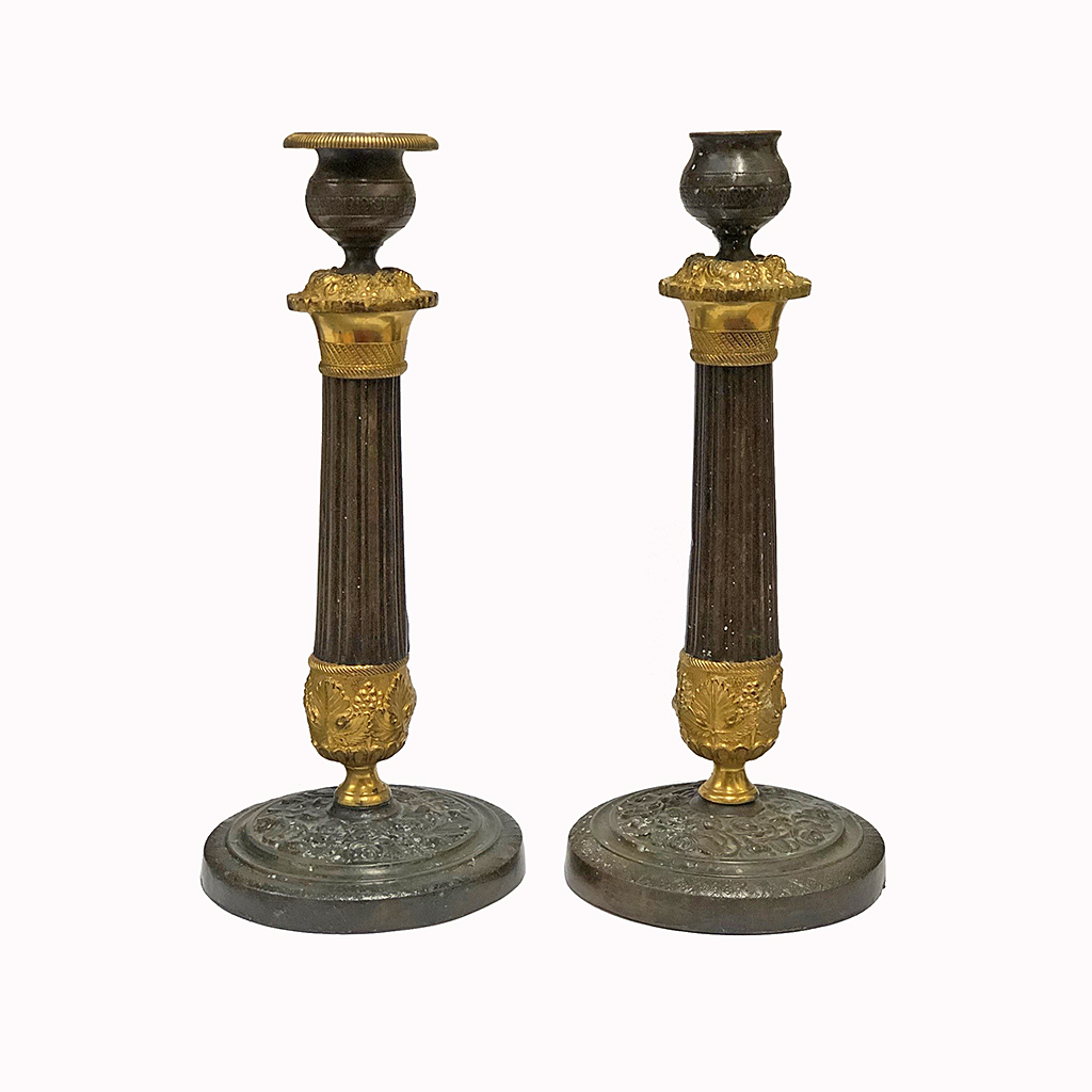 EMPIRE CANDLESICK BRONZE AND ORMOLU FLUTED WITH CIRCULAR BASE 24 CM HIGH 11 CM WIDE (X2)