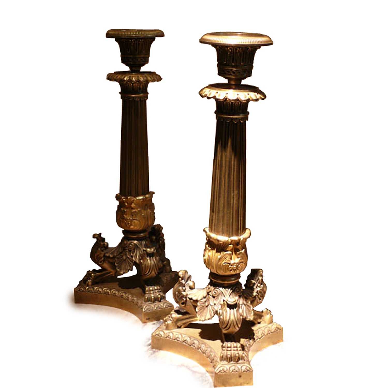 EMPIRE CANDLESTICK FLUTED STEM TRIPODIUM GRIFFIN FEET BASE TWO TONE ORMOLU 27 CM HIGH 12 CM WIDE (X2)