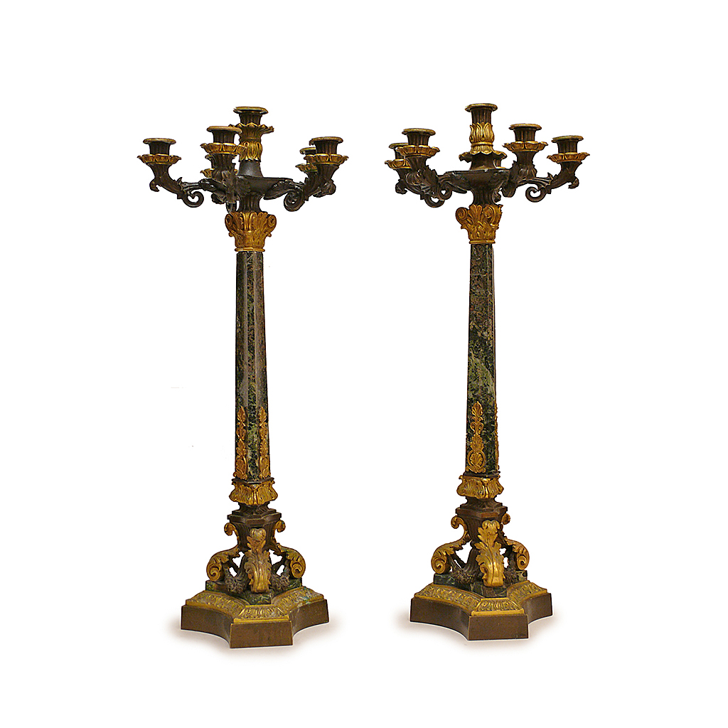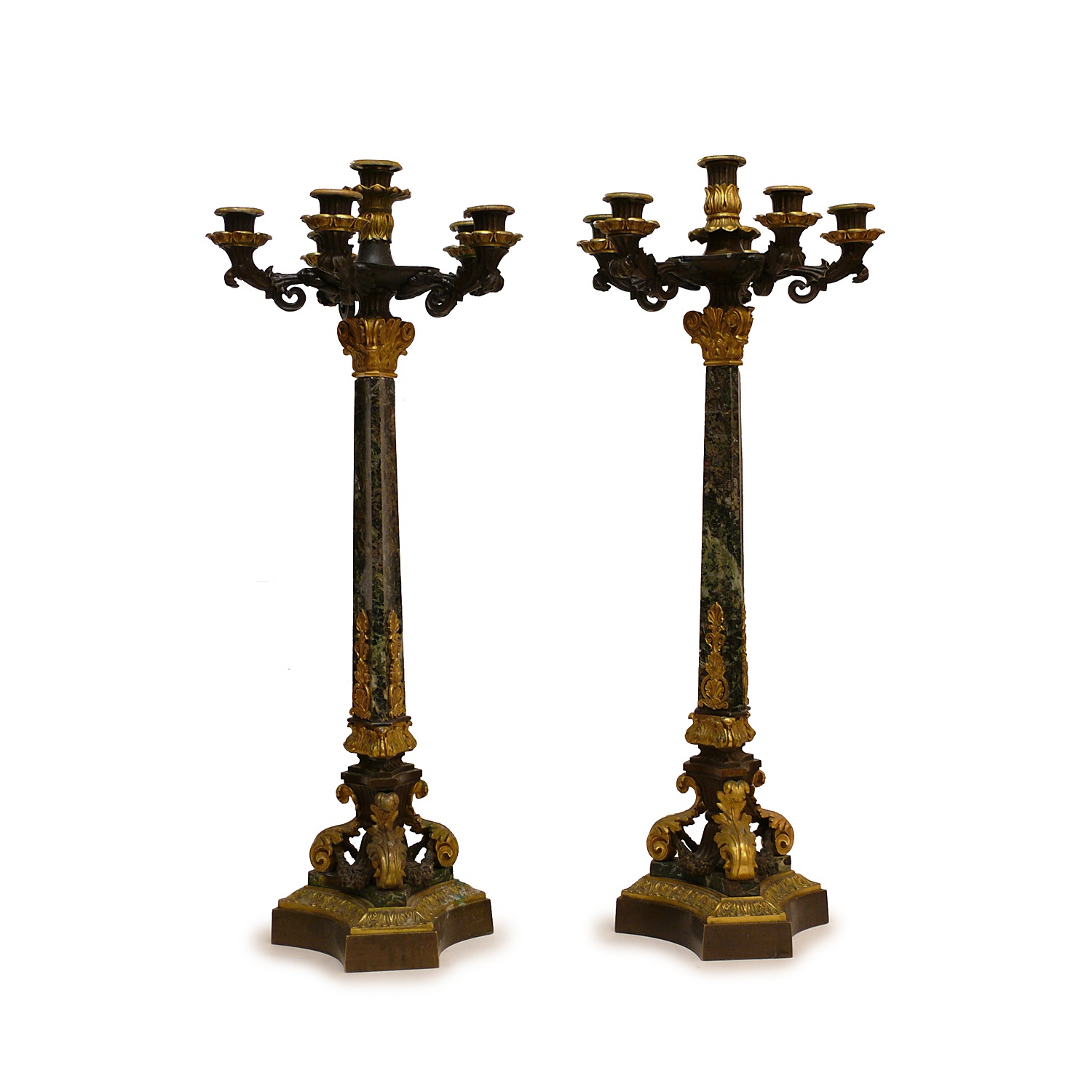EMPIRE GREEN MARBLE AND ORMOLU CANDELABRA SIX LIGHT THREE SIDED COLUMN 70 CM HIGH 30 CM WIDE (X2)