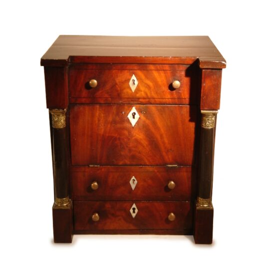 EMPIRE MAHOGANY TANTALUS BOX WITH EBONY COLUMN DROP FRONT 33 CM HIGH 27 CM WIDE 22 CM DEEP
