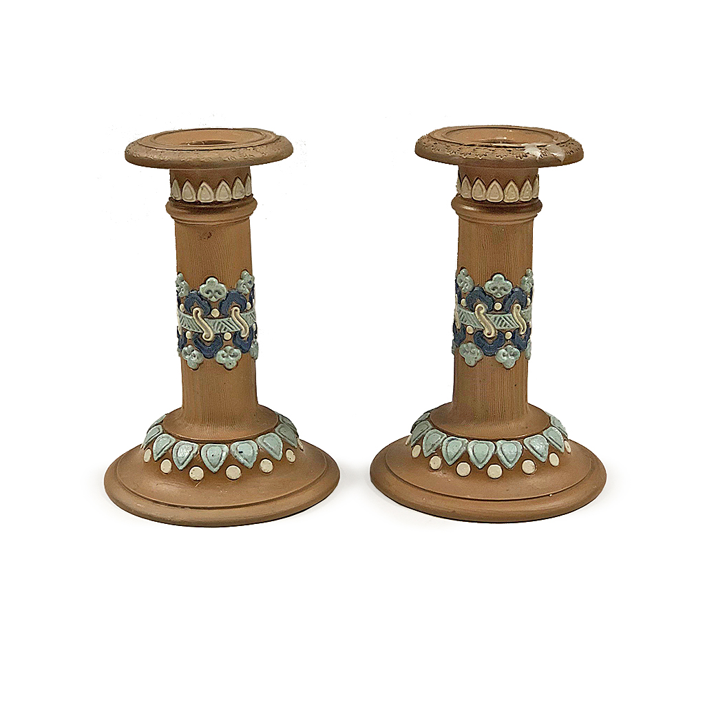 ENGLISH BROWN GLAZED CHINA CANDLESTICK 16 CM HIGH (X2)