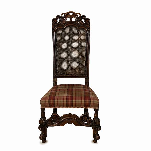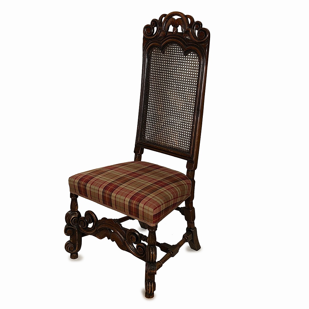 ENGLISH DINING CHAIR CARVED WALNU RATTAN BACK AND UPHOLSTERED TARTAN SEAT WILLIAM AND MARY STYLE 130 CM HIGH 58 CM WIDE (X6)