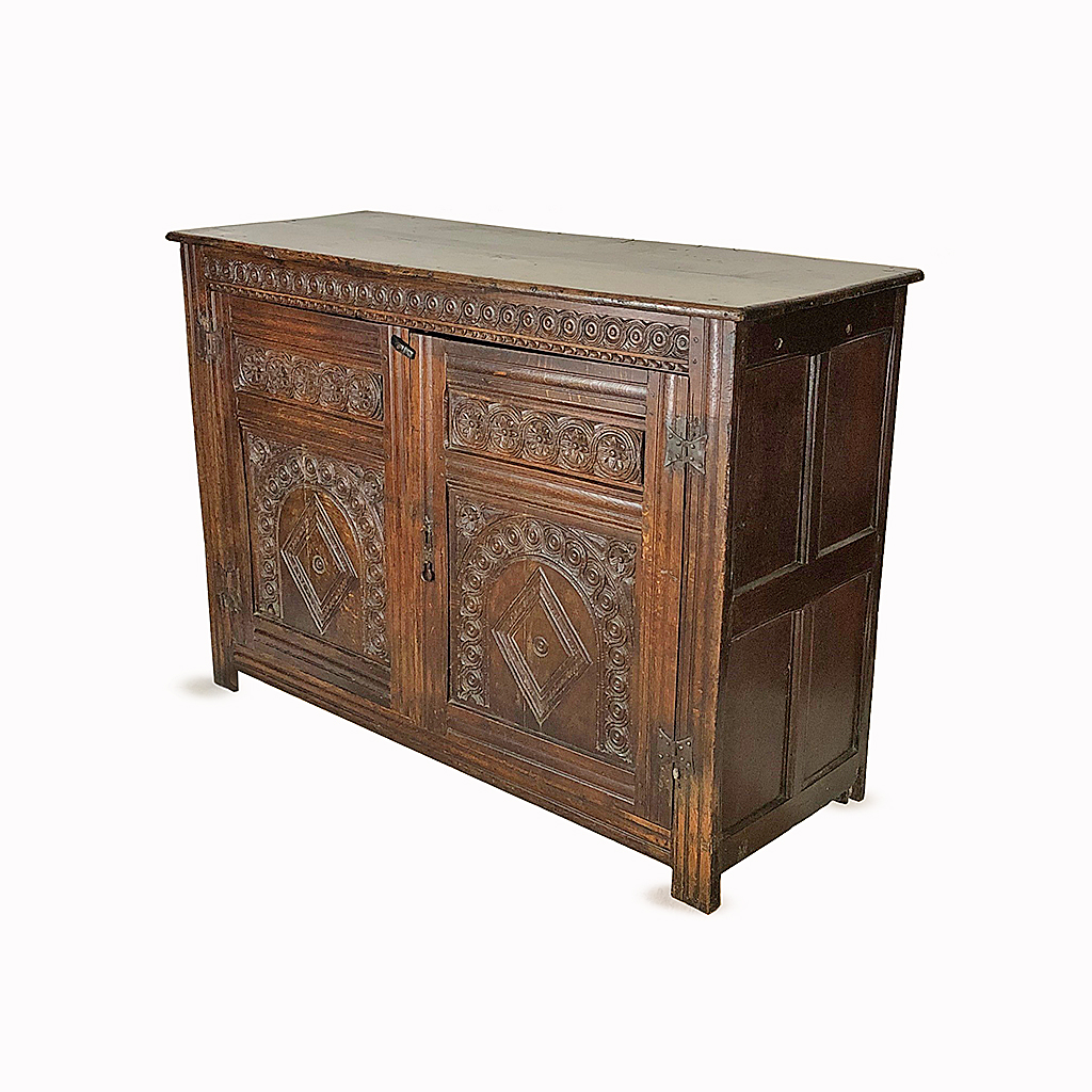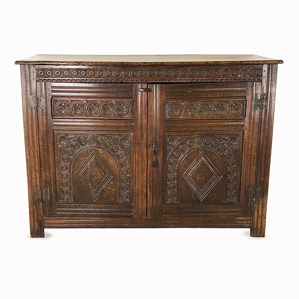 ENGLISH JOINED OAK CUPBOARD TWO CARVED ARCH PATTERN DOORS WITH BUTTERFLY HINGES 17TH CENT 107 CM HIGH 150 CM WIDE 57 CM DEEP