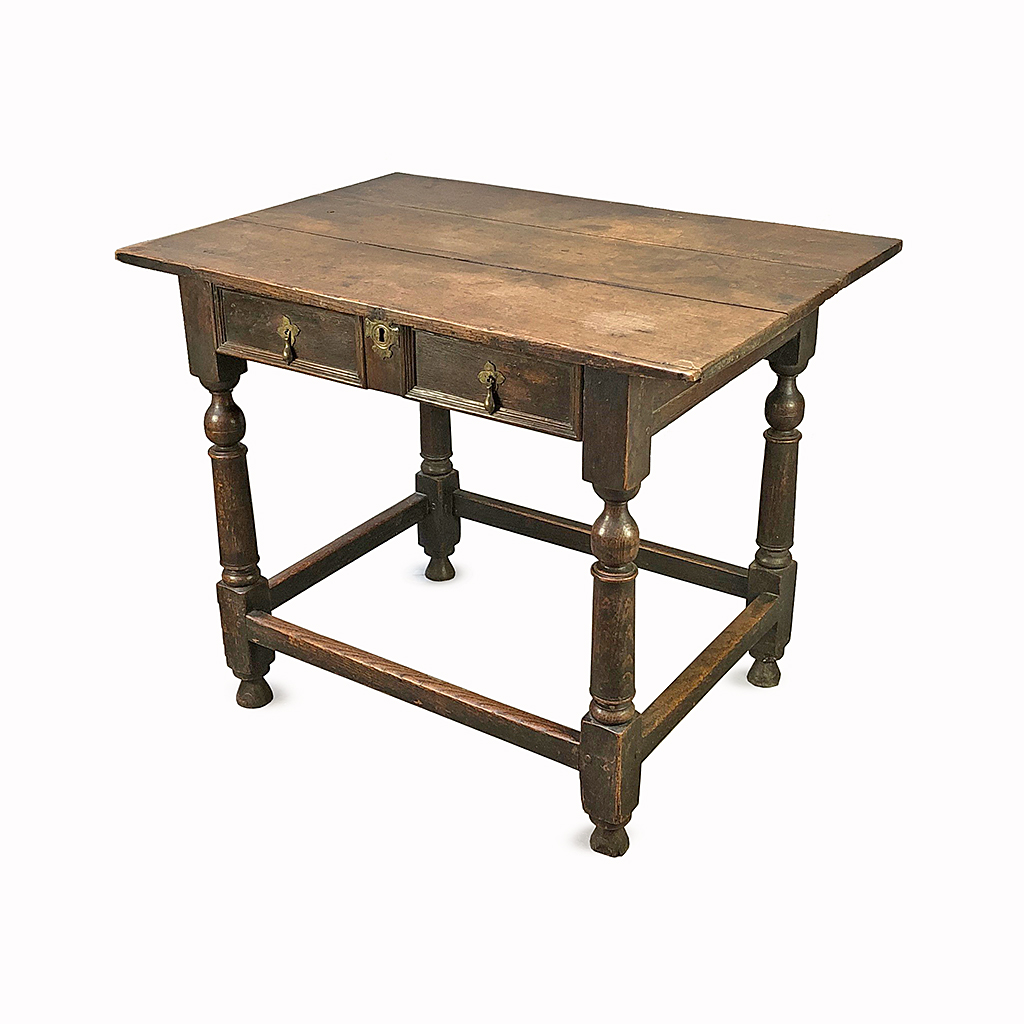 ENGLISH JOINED OAK SIDE TABLE WITH SINGLE DRAWER TURNED LEGS AND PERIPHERAL STRETCHERS 72 CM HIGH 90 CM WIDE 63 CM DEEP CIRCA 1700