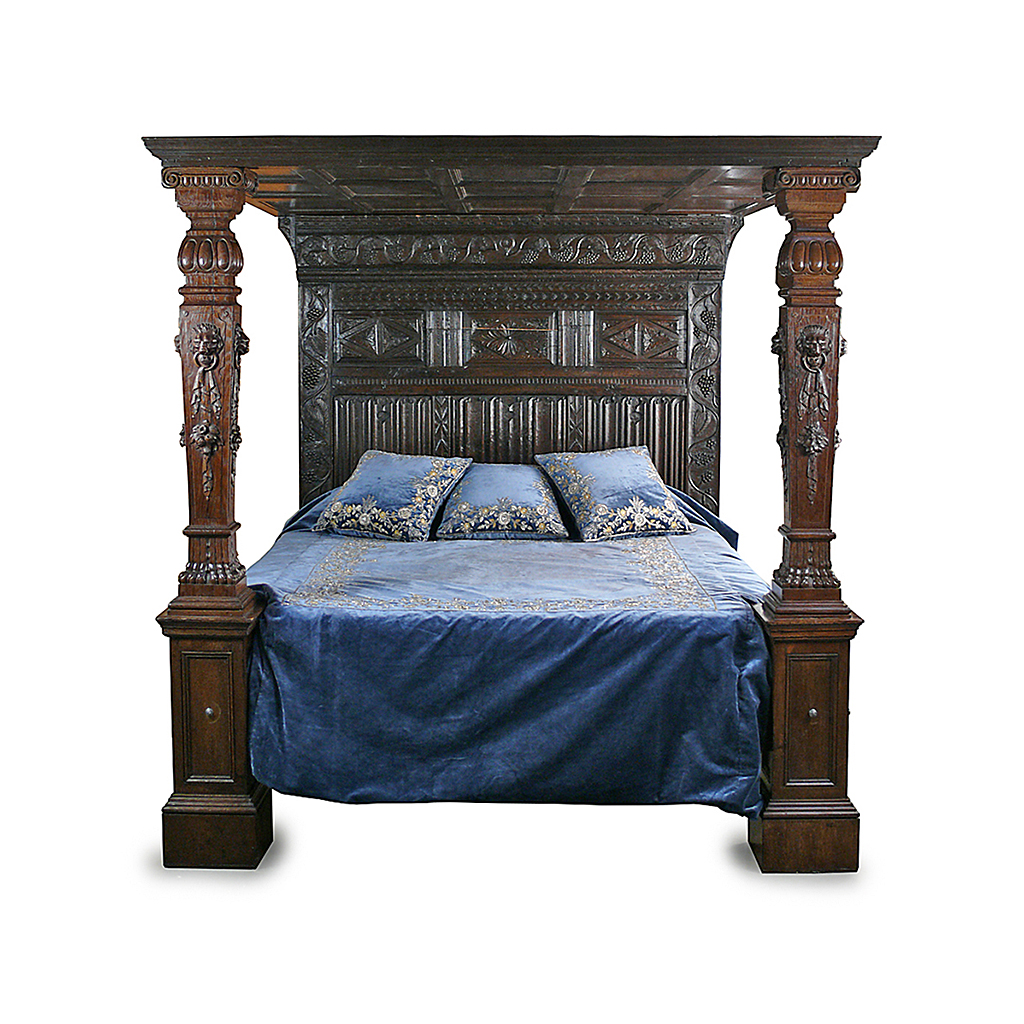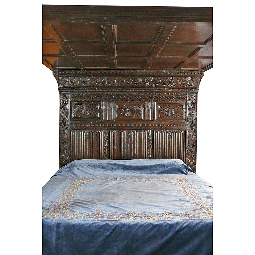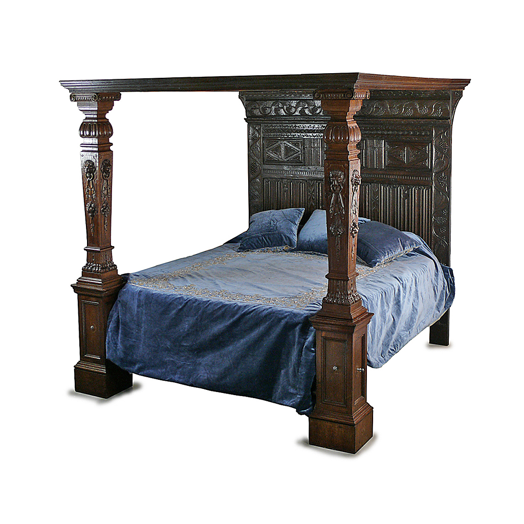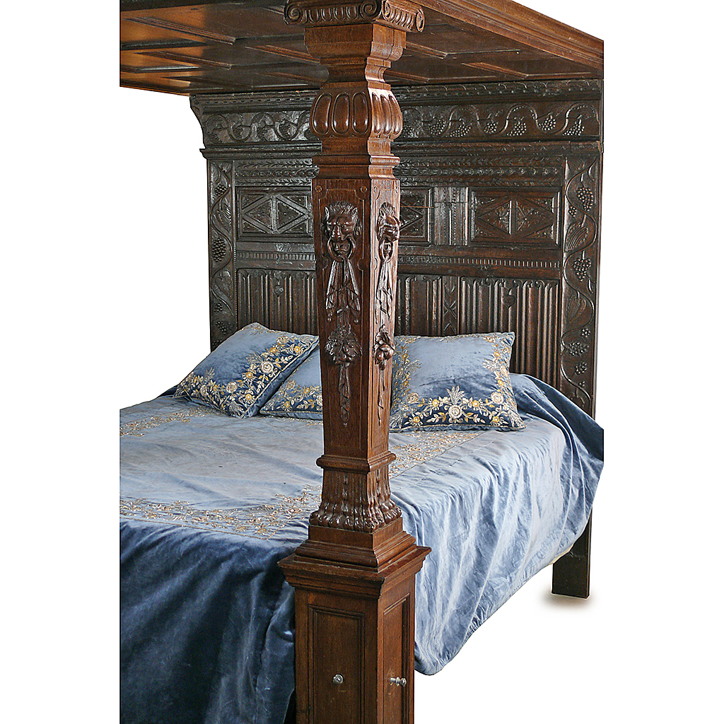 ENGLISH OAK FULL TESTER / FOUR POSTER BED FOOT POSTS WITH LION AND PENDANT GARLANDS HEADBOARD WITH TRAILING VINES 17TH CENT STYLE COMPLETE WITH MATTRESS 203 CM HIGH 211 CM LONG 197 CM WIDE