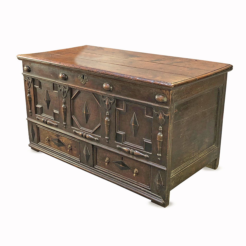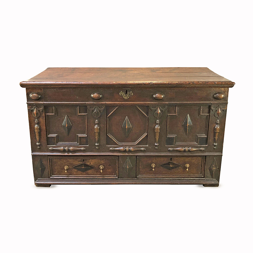 ENGLISH OAK MULE CHEST WITH THREE FRONT PANELS TWO DRAWERS AND FACET CUT LOZENGE APPLIQUES 18TH CENT 70 CM HIGH 127 CM WIDE 66 CM DEEP