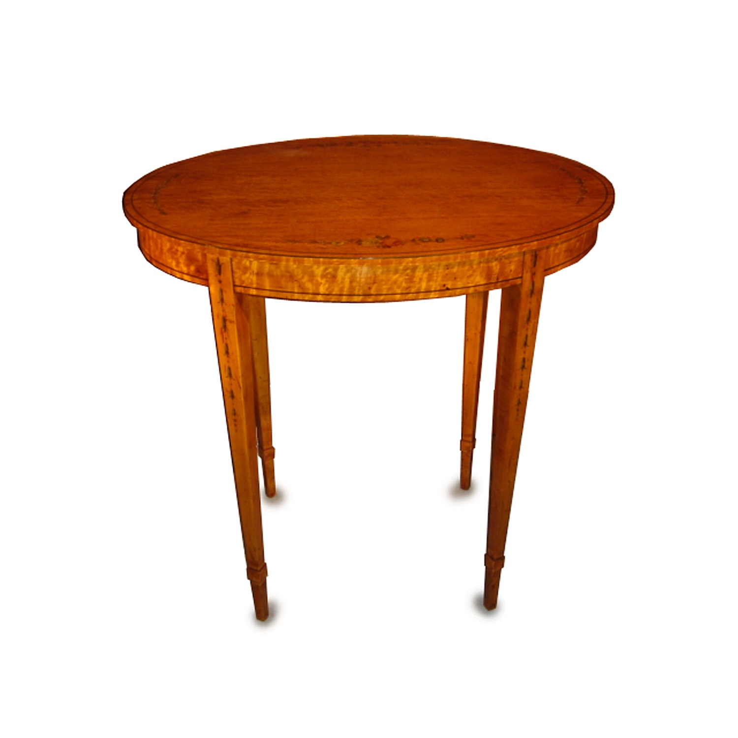ENGLISH OVAL DECORATED SATINWOOD OCCASIONAL TABLE WITH TAPERING LEGS ON SPADE FEET 2'5/i LONG 75 CM