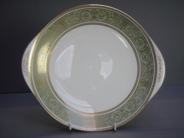 ENGLISH RENAISSANCE DOULTON CIRCULAR TWIN HANDLE B AND B PLATE GREEN GOLD BORDER 27 CM (X3)