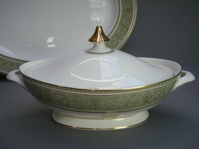 ENGLISH RENAISSANCE DOULTON OVAL VEGETABLE DISH WITH LID GREEN GOLD BORDER (X3)