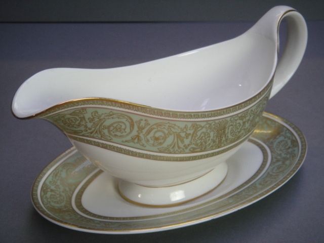 ENGLISH RENAISSANCE DOULTON SAUCE BOAT AND STAND GREEN GOLD BORDER