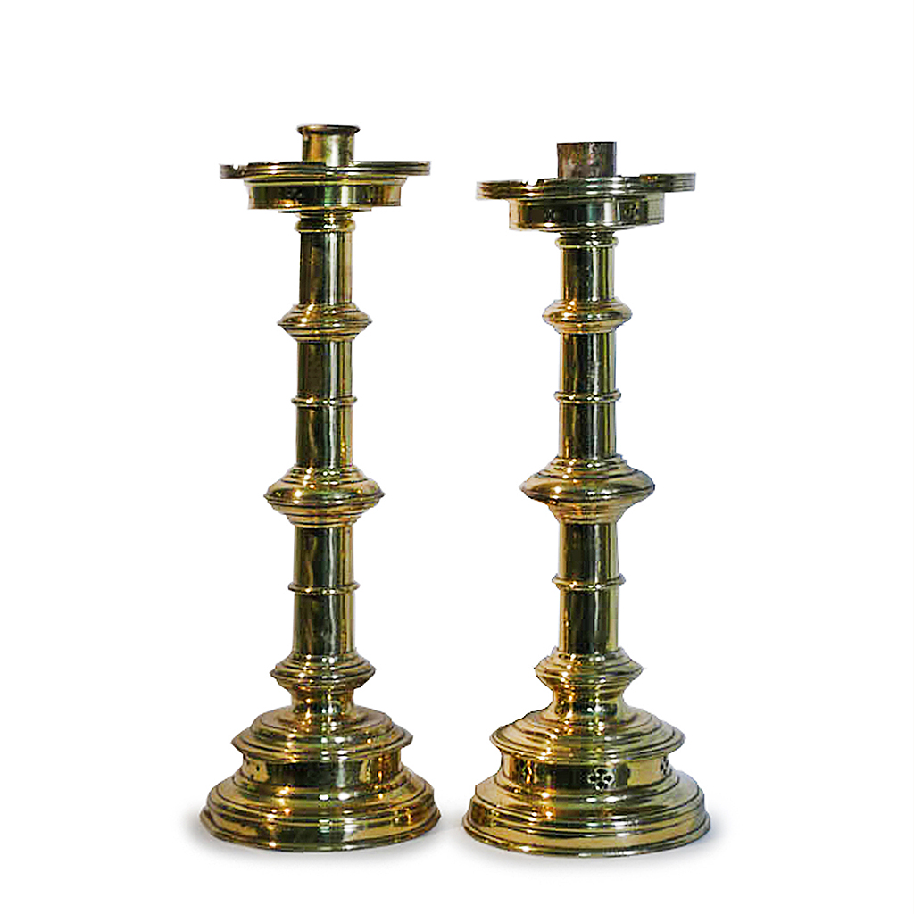 ENGLISH SIMPLE BRASS CANDLESTICK SHALLOW CASTELLATED TOP VICTORIAN CIRCA 1860 40 CM HIGH 13 CM WIDE (X4)