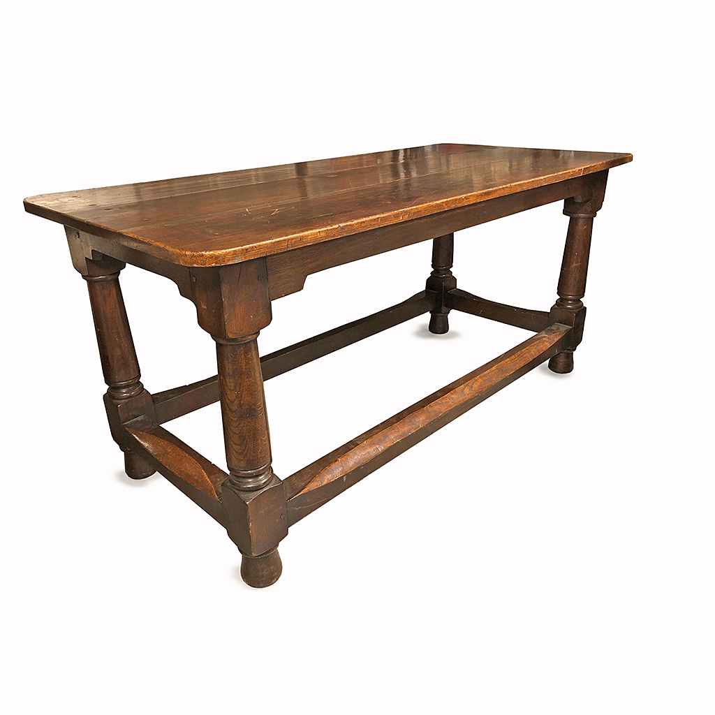 ENGLISH SIMPLE OAK REFECTORY TABLE WITH ROUNDED CORNERS HEAVY TURNED LEGS AND STRETCHERS 164 CM LONG 78 CM WIDE 78 CM HIGH