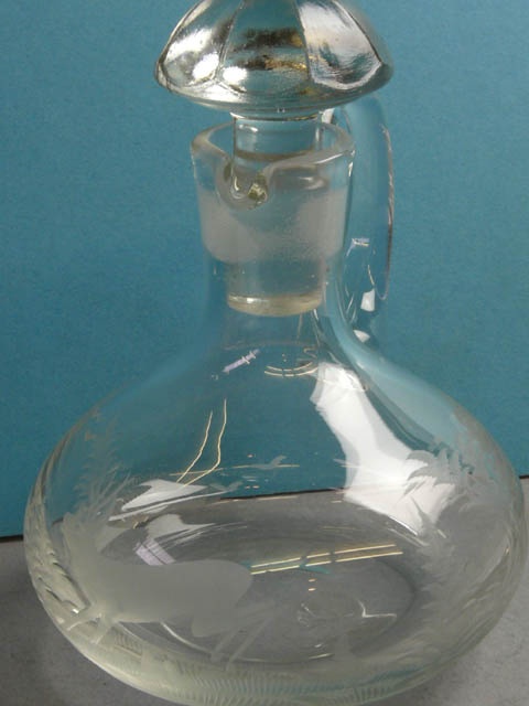 ENGRAVED CRYSTAL OLIVE OIL DECANTER PLUS STOPPER TREES AND DEER DESIGN