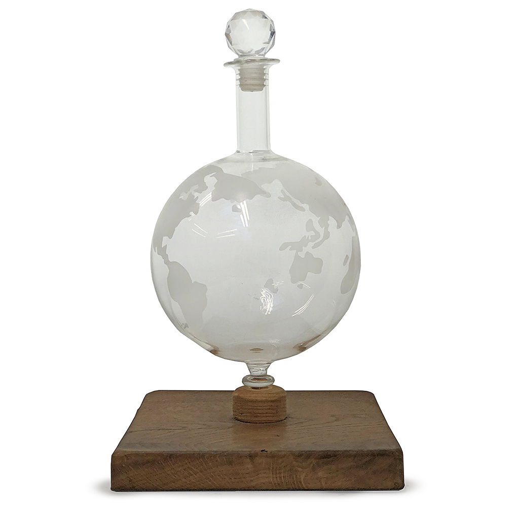 ETCHED GLASS DECANTER AND STOPPER IN THE FORM OF THE GLOBE ON SQUARE WOOD PLINTH 28 CM HIGH