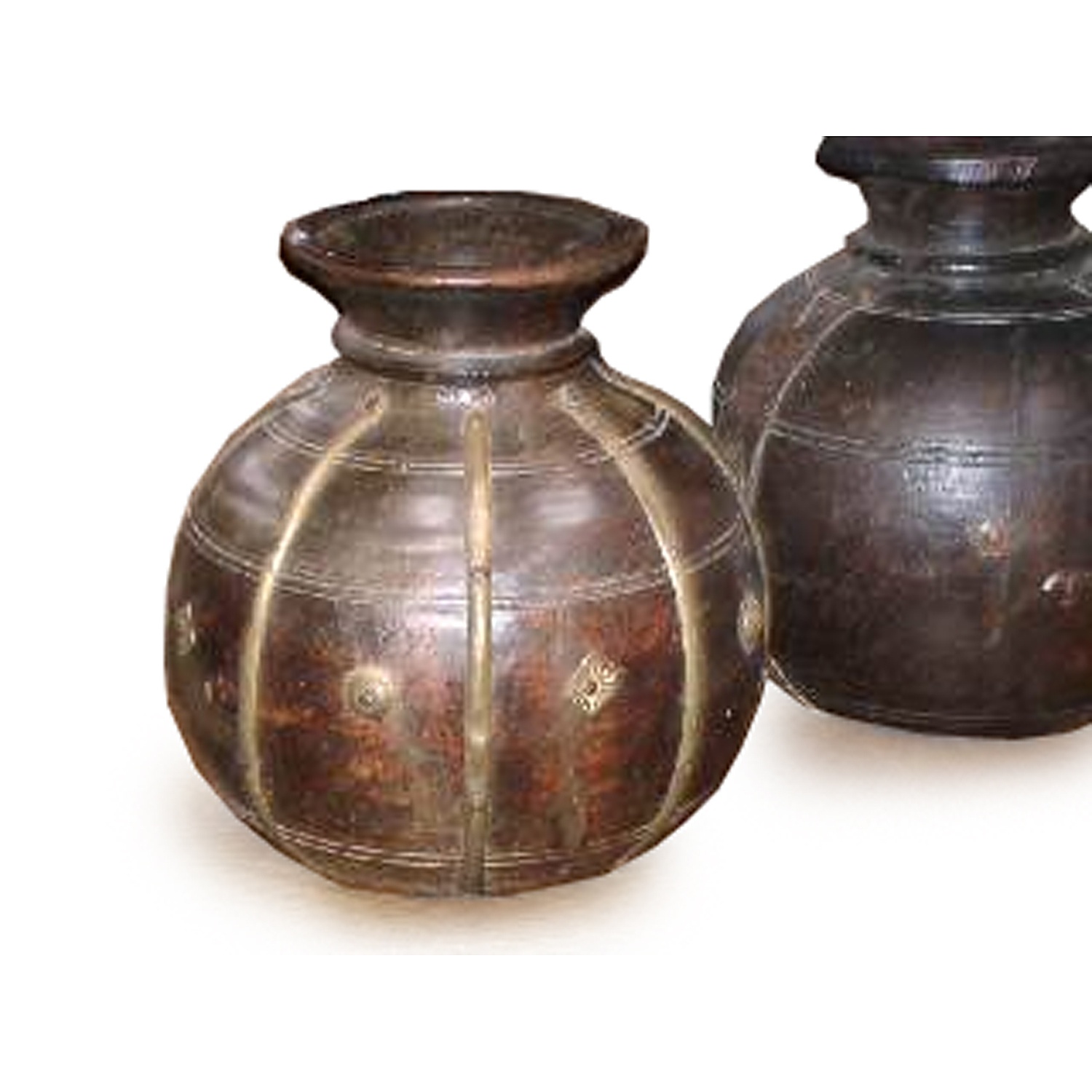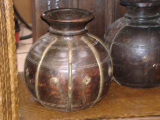 ETHNIC WOODEN BRASS BOUND VASE / WATER CARRIER (X2)
