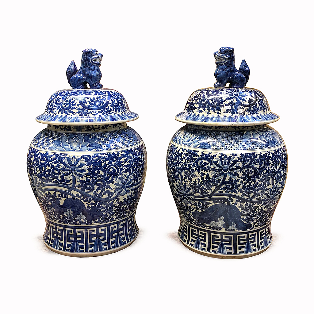 EXTRA LARGE CHINESE BLUE AND WHITE SPILL VASE KYLON LID 61 CM HIGH (X2)
