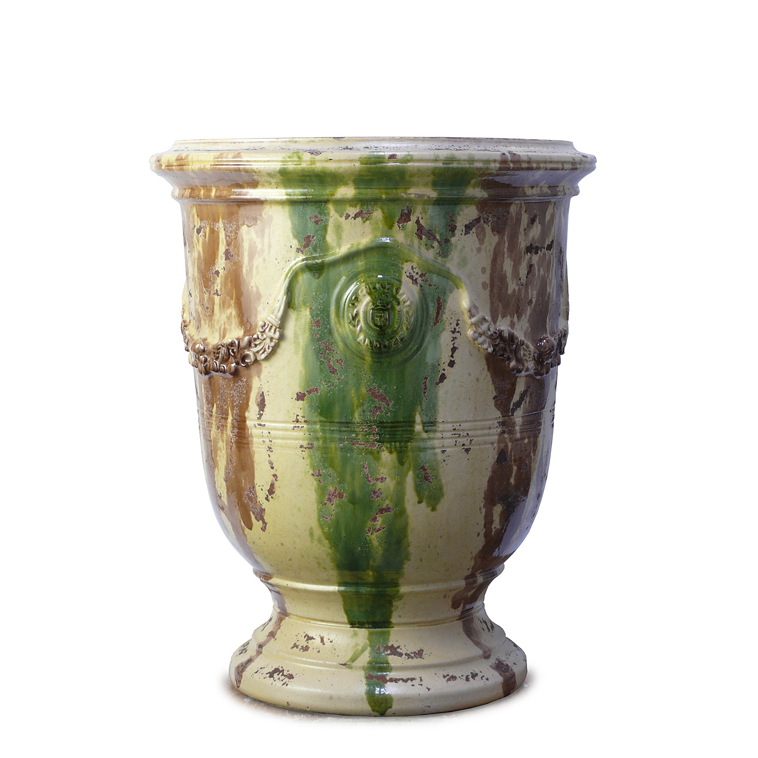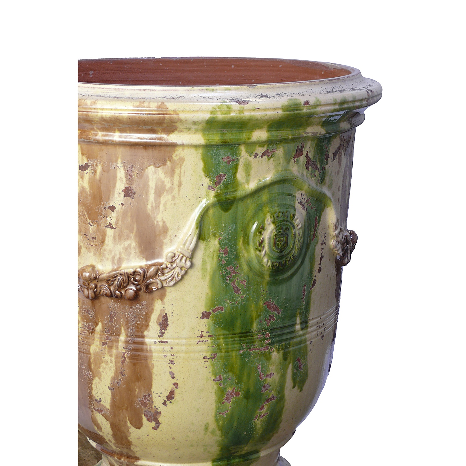 EXTRA LARGE FRENCH ANDUZ GARDEN URN BELL SHAPED GLAZED TERRACOTTA YELLOW AND GREEN WITH SWAGS 82 CM HIGH 75 CM DIAM (X2)