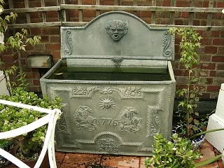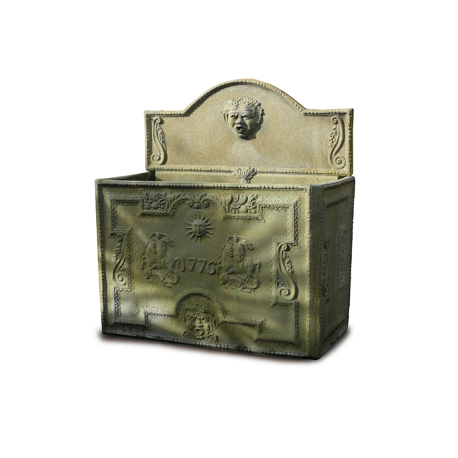 FAUX BRONZE WALL FOUNTAIN / TROUGH WIDE BEARING THE DATE 1776 WITH FACE BACK PLATE 105 CM HIGH 94 CM WIDE 48 CM DEEP