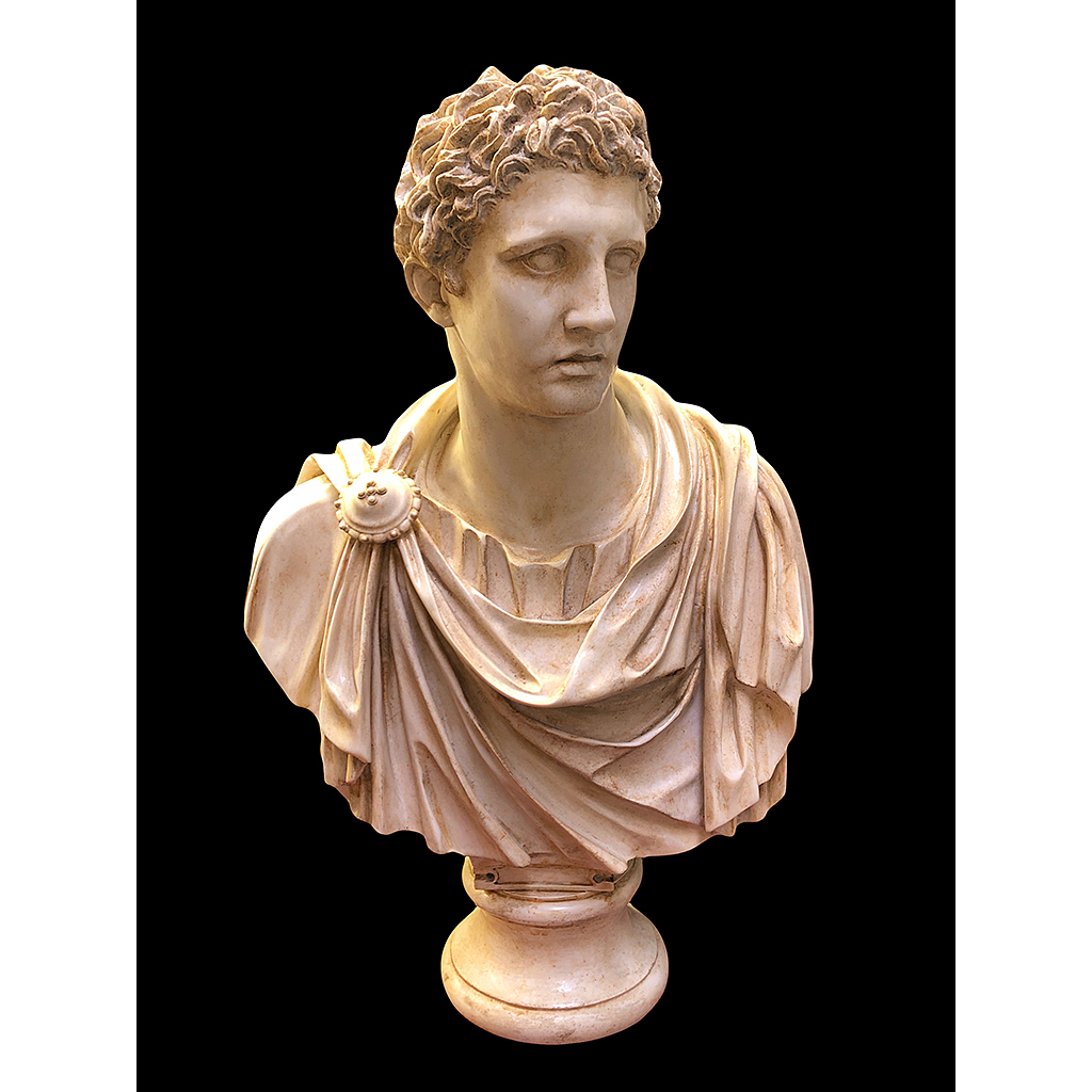 FAUX MARBLE ROMAN BUST OF MARK ANTHONY IN TOGA ROBES ON A SOCLE BASE 79 CM HIGH 56 CM WIDE 28 CM DEEP