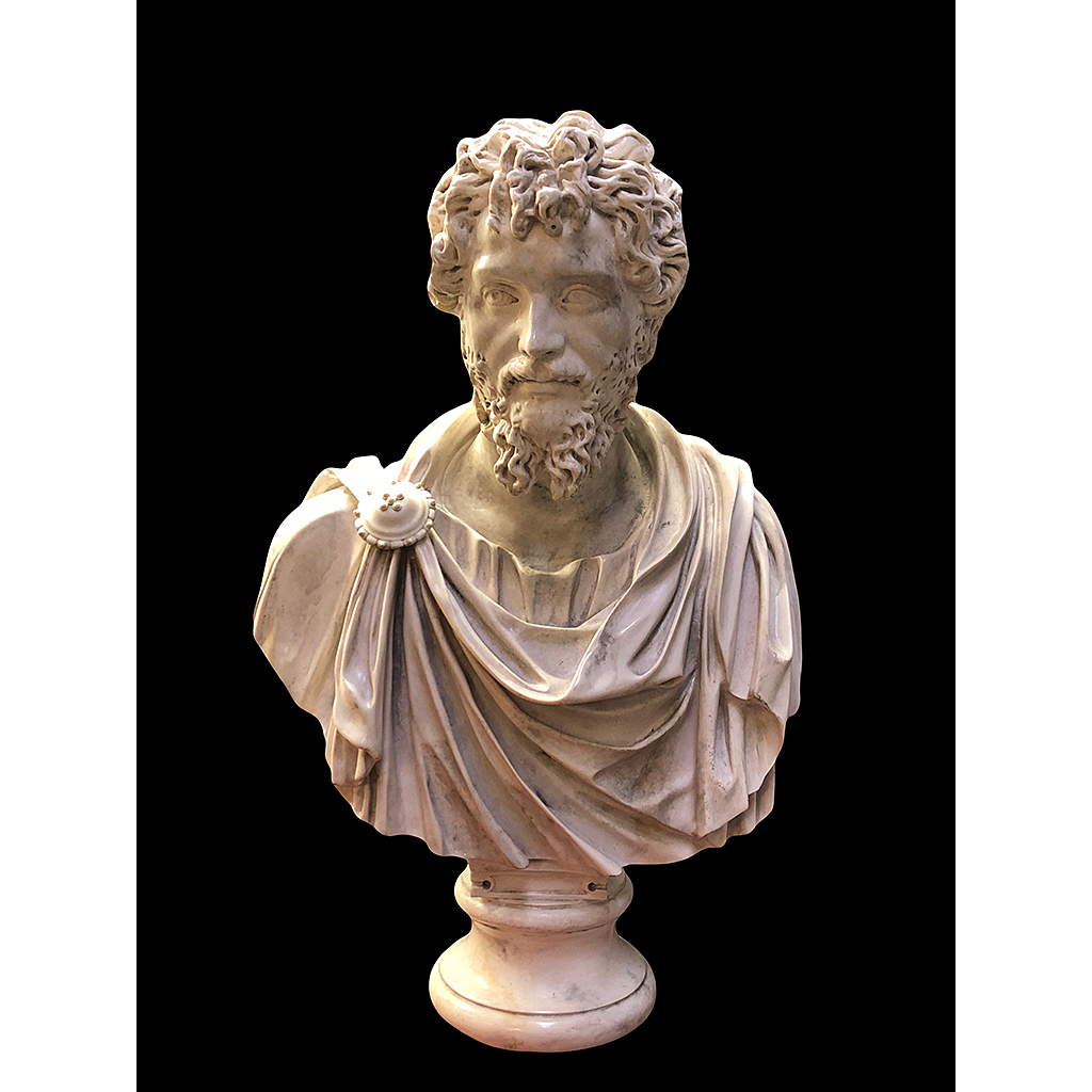 FAUX WHITE MABLE ROMAN BUST OF MARCUS AURELIUS WEARING TOGA ON A SOCLE BASE 80 CM HIGH 56 CM WIDE 28 CM DEEP