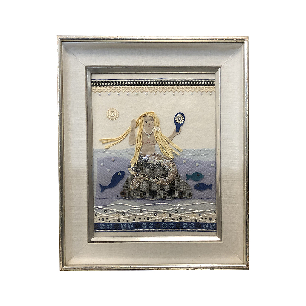 FELT COLLAGE OF A MERMAID BY PRUE NUTTALL C1965 IN A PERIOD SILVER GILT AND WHITE CANVAS BOX FRAME 18" X 15"