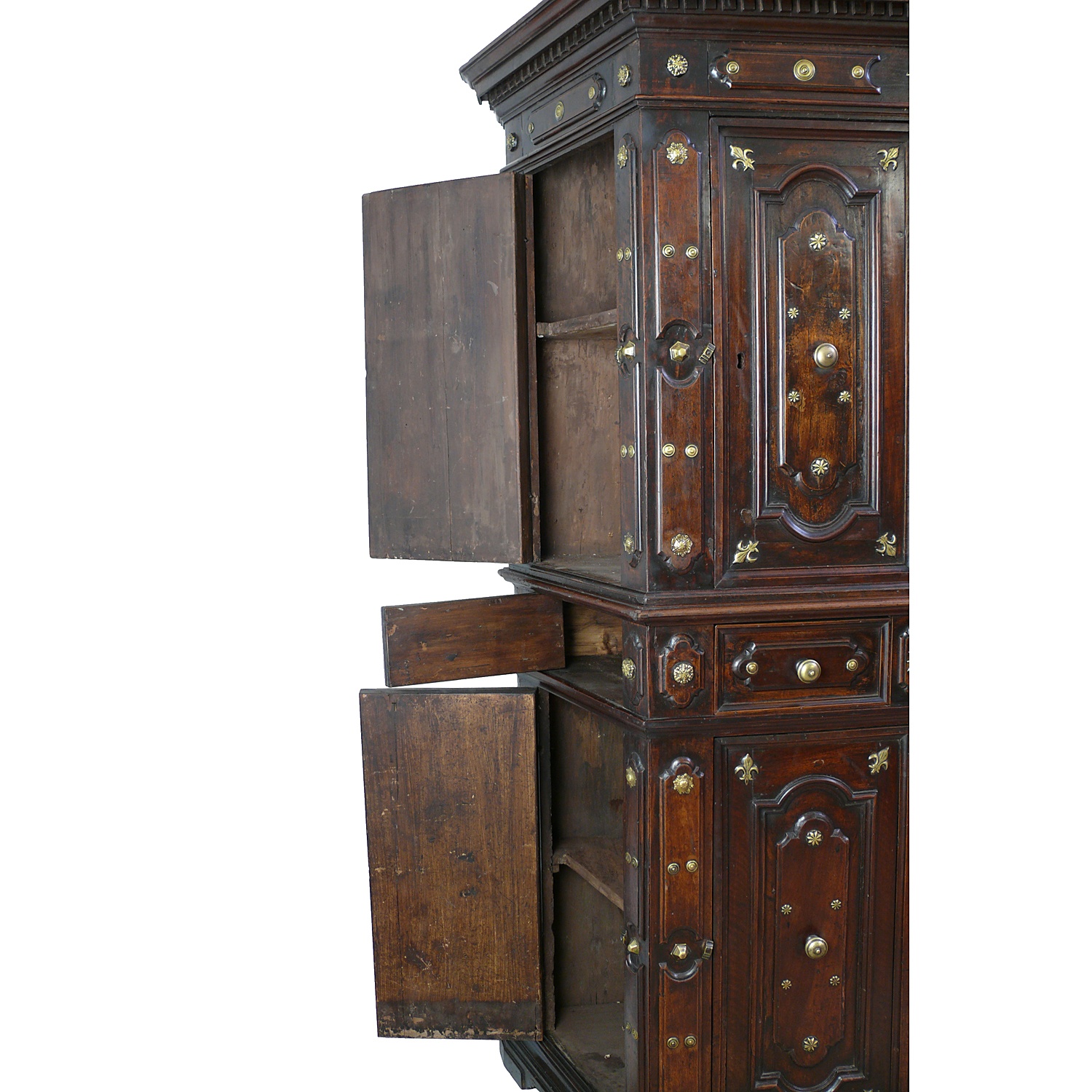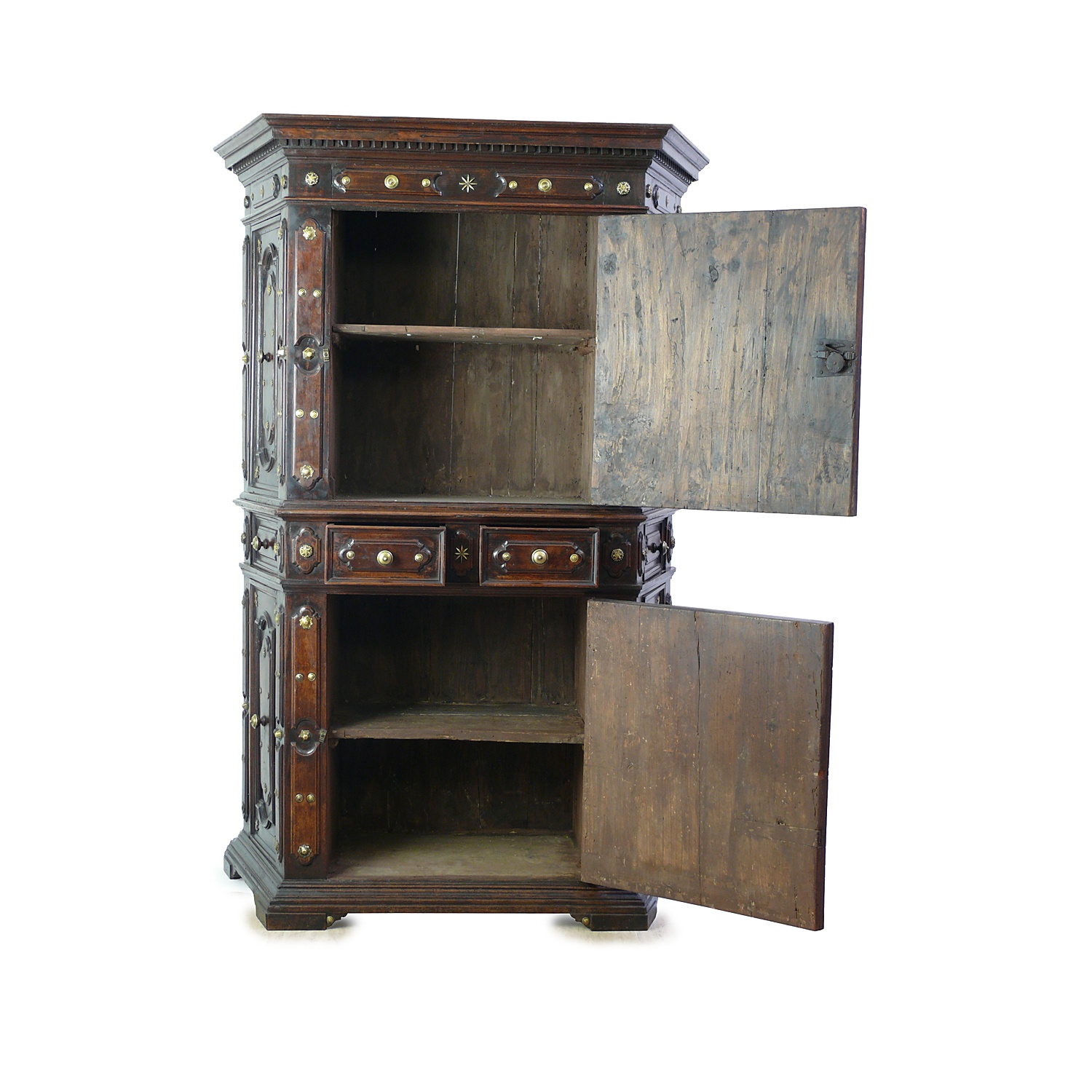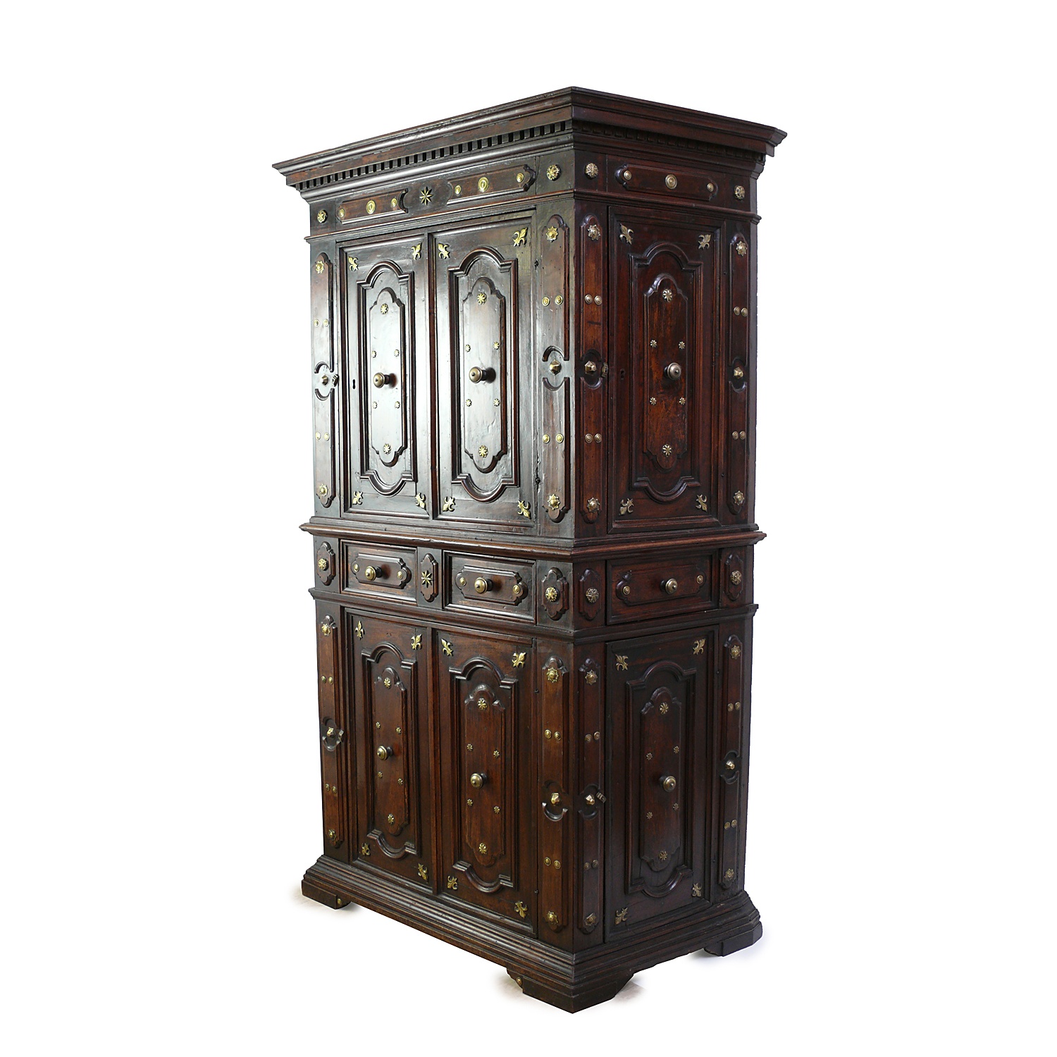 FINE 16TH CENT ITALIAN WALNUT CUPBOARD IN TWO PARTS WITH BRASS STUDDED MOUNTS BOLOGNA 191 CM HIGH 124 CM WIDE 58 CM DEEP