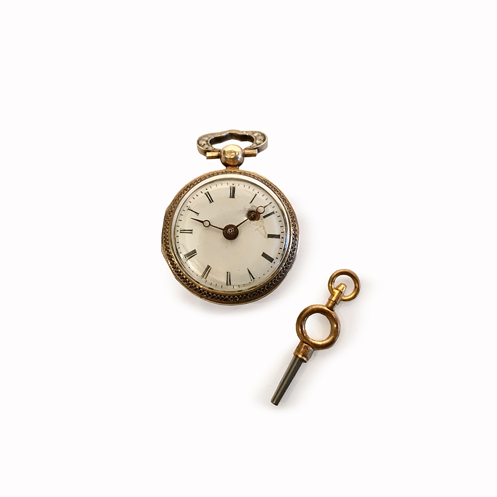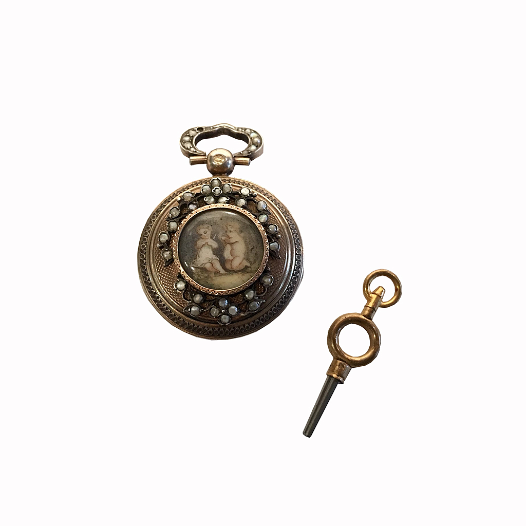 FINE 17TH CENTURY SILVER LADY'S POCKET FOB WATCH INSET WITH SEED PEARLS AND PAINTED CHINA PANEL ON REVERSE (WITH ORIGINAL KEY)
