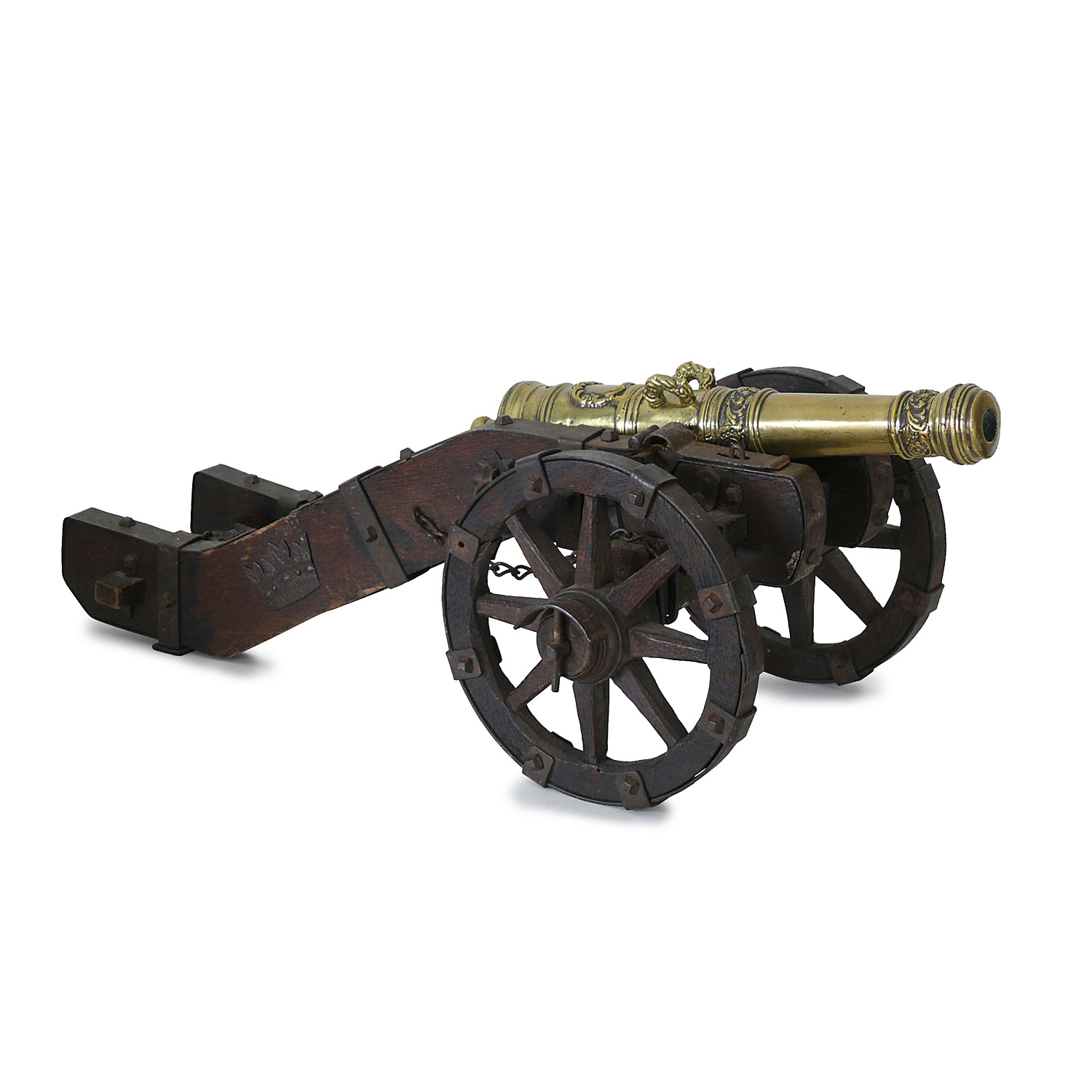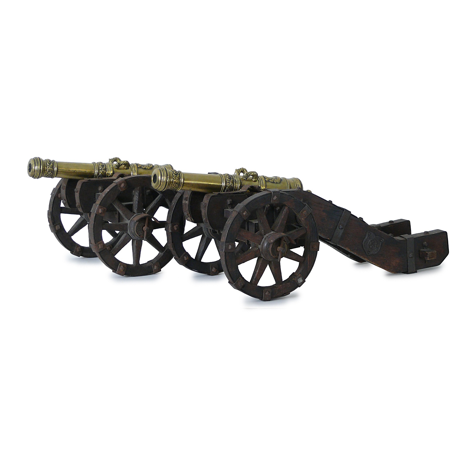 FINE 19TH CENT TABLE CANNON 12/i ORNATE BARREL ON IRON BOUND OAK CARRIAGE (X2)