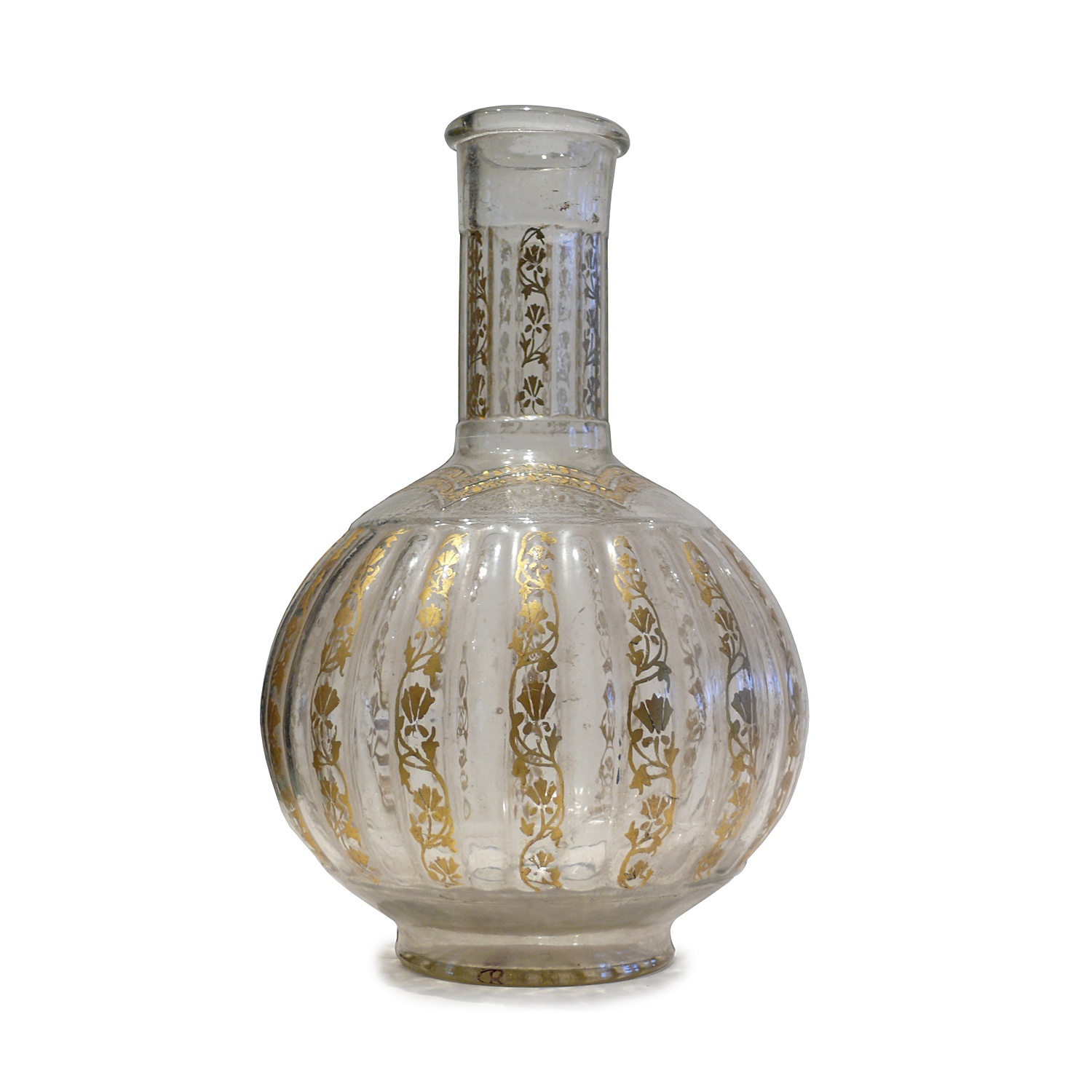 FINE EARLY ISLAMIC GLASS BOTTLE SHAPE VASE WITH GILT DECORATION SIGNED CR 12/i HIGH