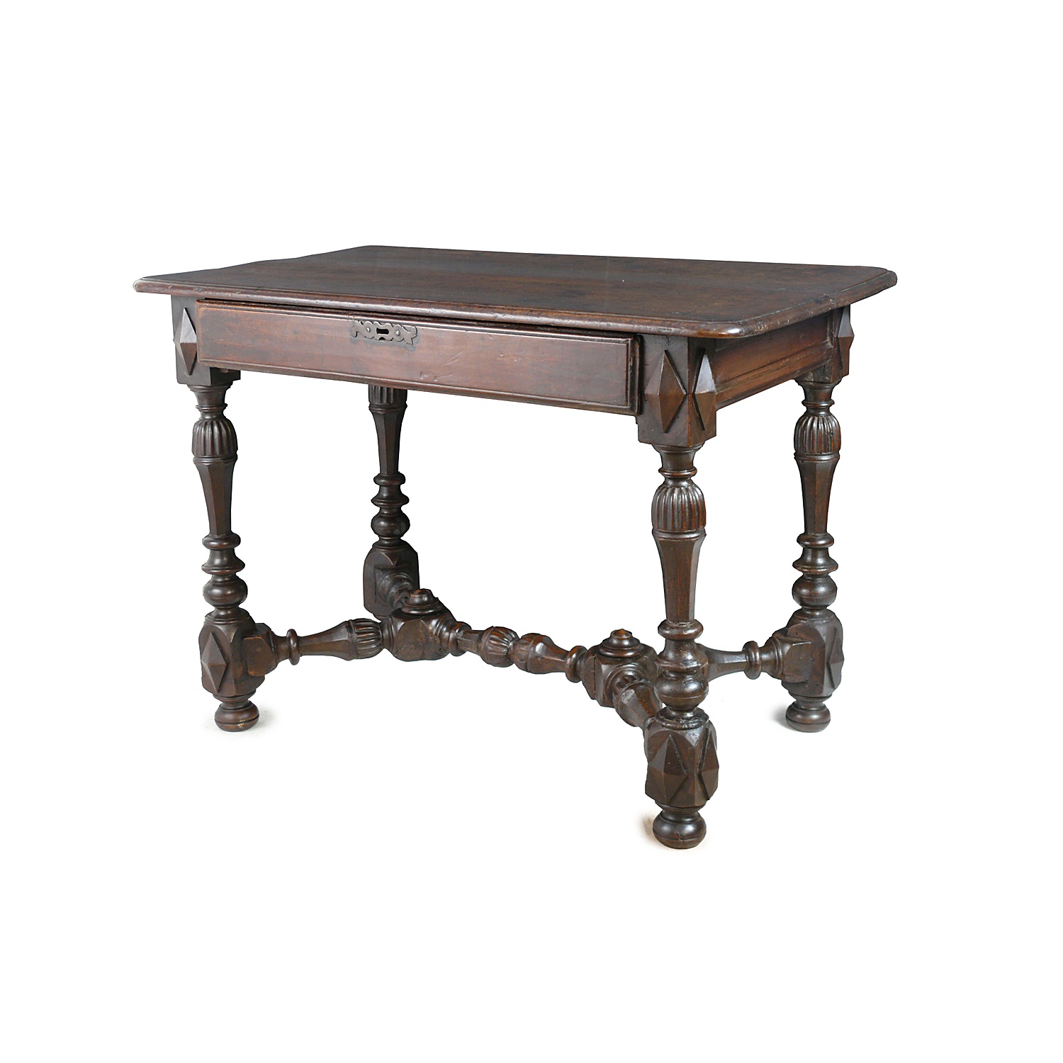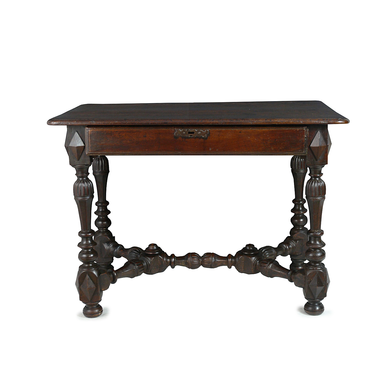 FINE LOUIS XIV WALNUT TABLE CARVED WALNUT WITH ORNATE DOUBLE Y STRETCHER 77 CM HIGH 111 CM WIDE 66 CM DEEP