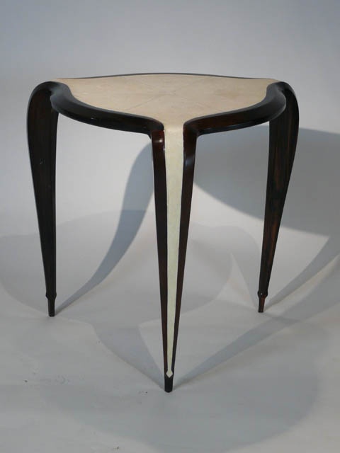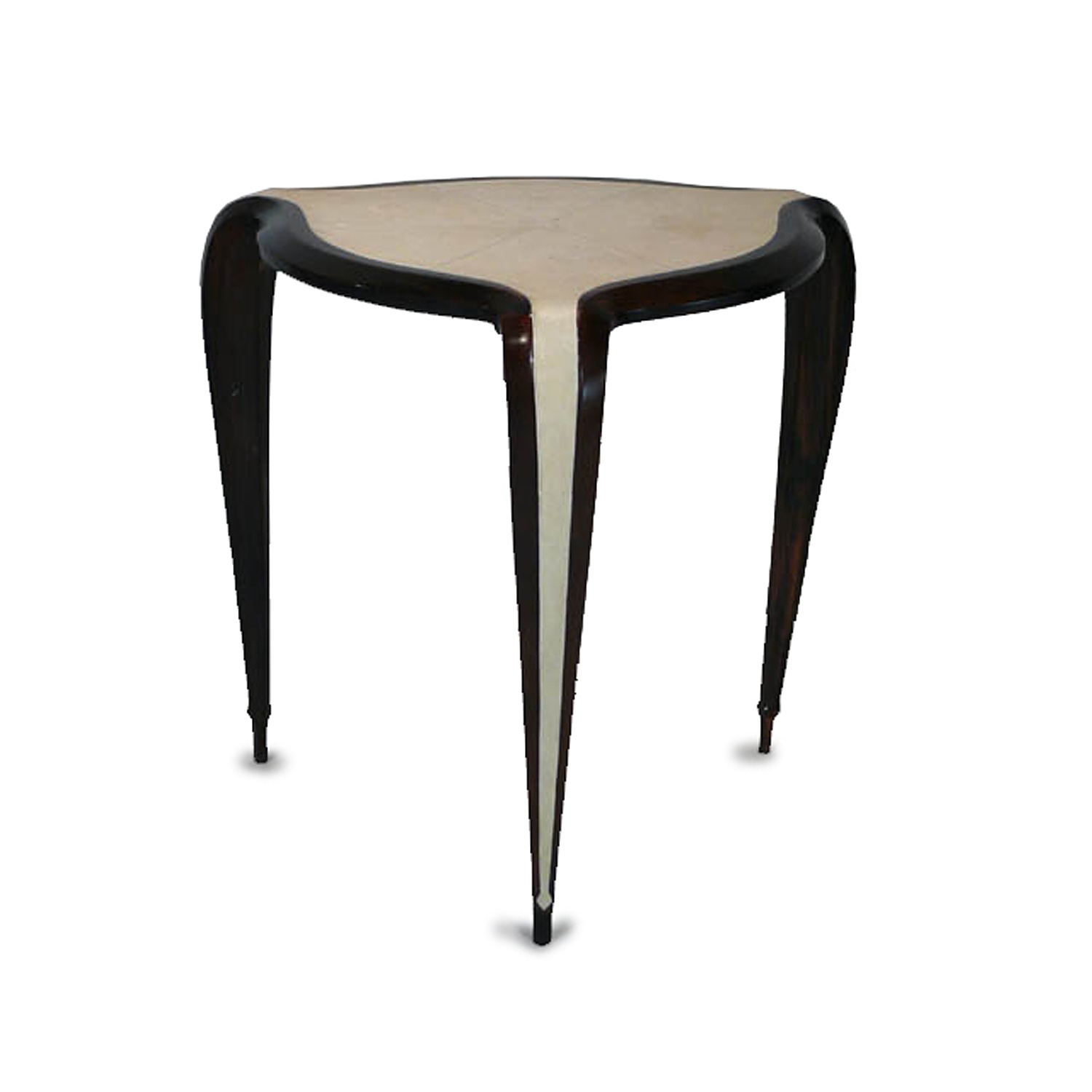 FINE ROSEWOOD AND SHAGREEN LOW TRI LEG OCCASIONAL TABLE AFTER A MODEL BY PIERRE ROUSEAU 51 CM HIGH X 53 CM DEEP (X2)