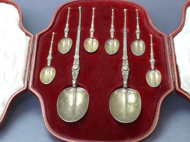 FINE SET OF SILVER GILT ANNOINTING SPOONS INC. 6 SMALL AND 2 LARGER IN FITTED RED LEATHER CASE