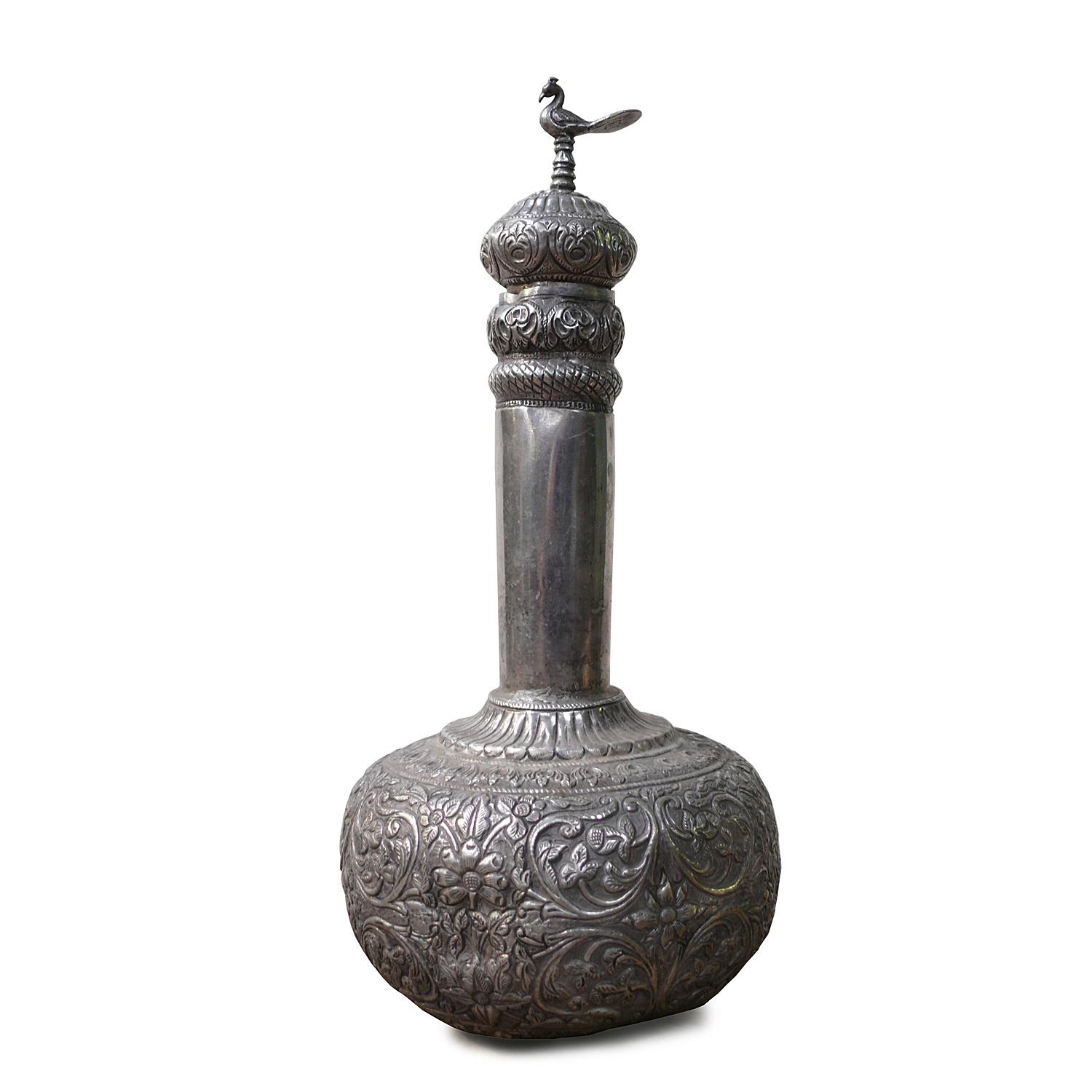 FINE SILVER ISLAMIC LARGE SURAHI PERFUME BOTTLE WITH PEACOCK LID 14" HIGH
