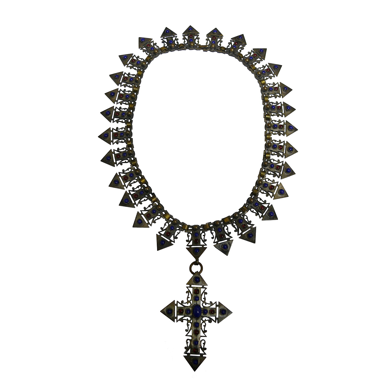 FINE VICTORIAN NECKLACE BRONZED METAL INSET RED AND BLUE STONES WITH CRUCIFIX / CROSS PENDANT CIRCA 1870