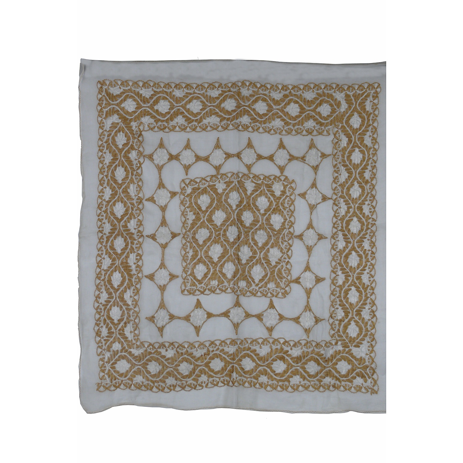 FINE WHITE ORGANZA TABLECLOTH WITH GOLD GEOMETRIC FLORAL DESIGN 4'2/i X 3'7/i