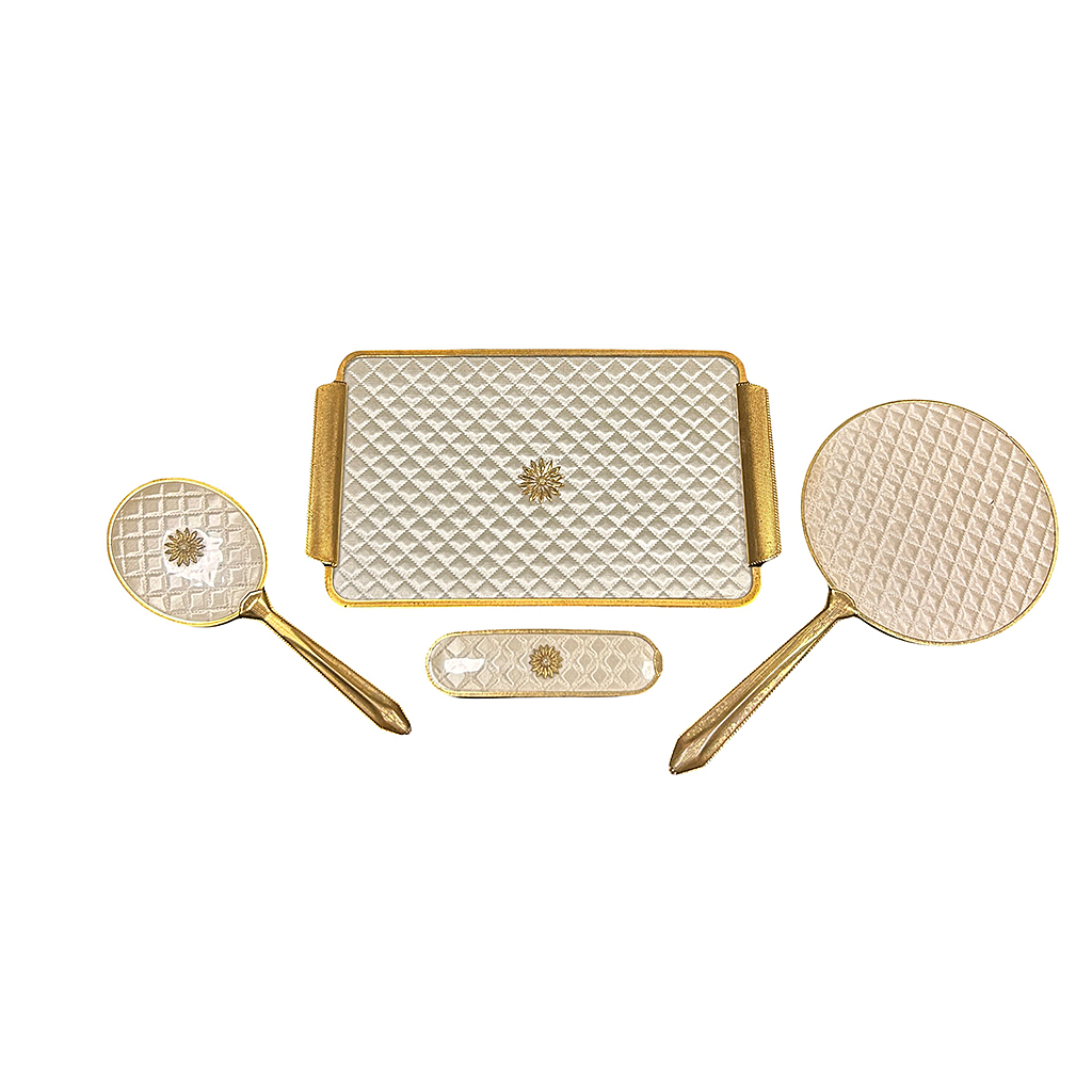 FOUR PIECE QUILTED CREAM FABRIC AND GILT DRESSING TABLE SET COMPRISING OF HAIR BRUSH HAND MIRROR CLOTHES BRUSH AND TRAY