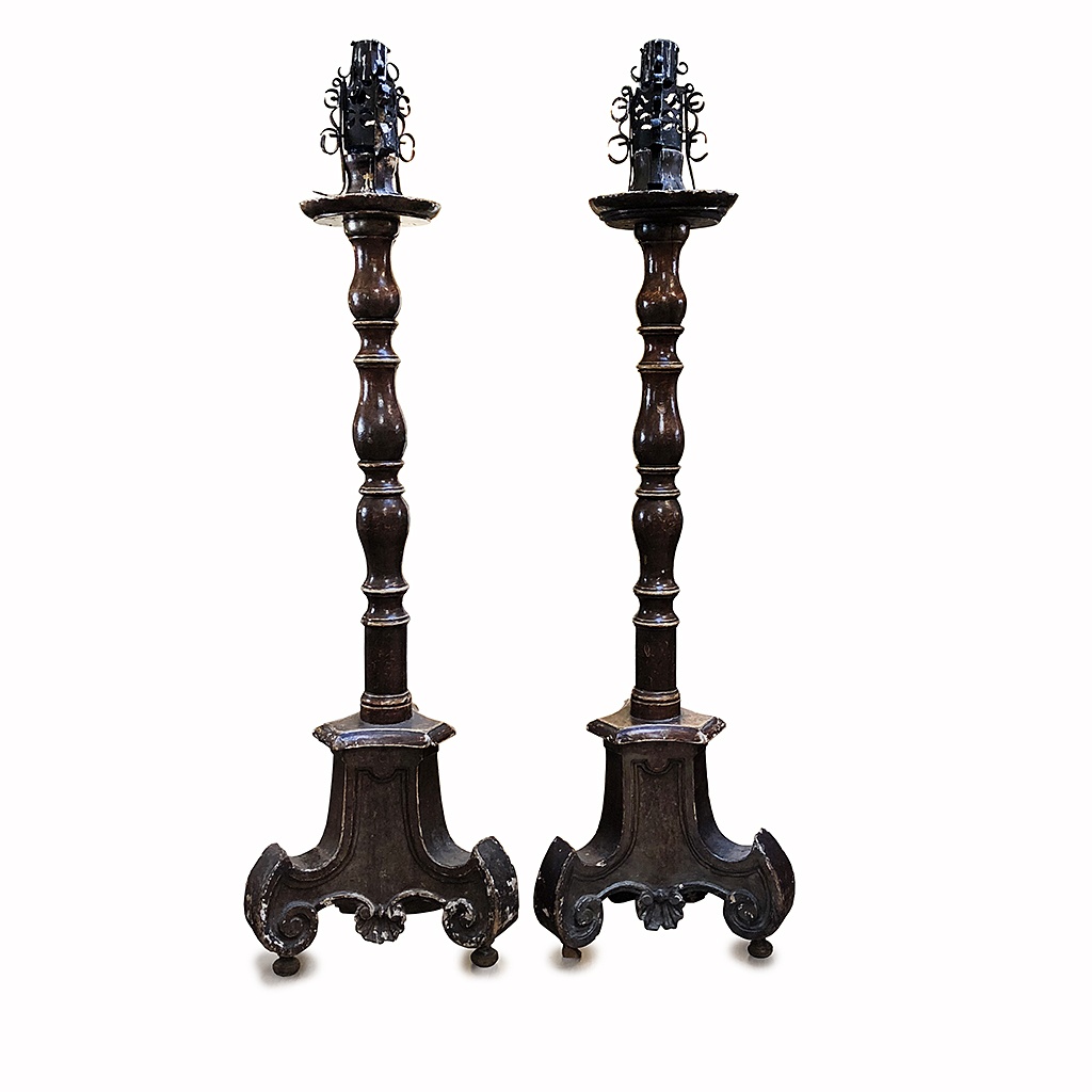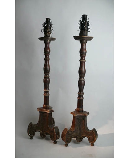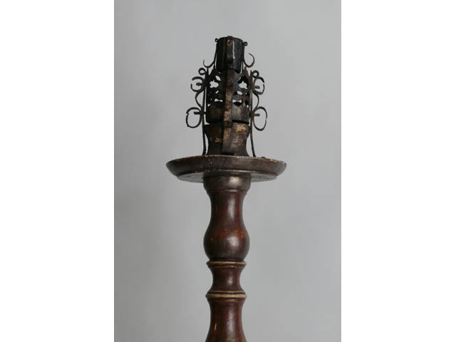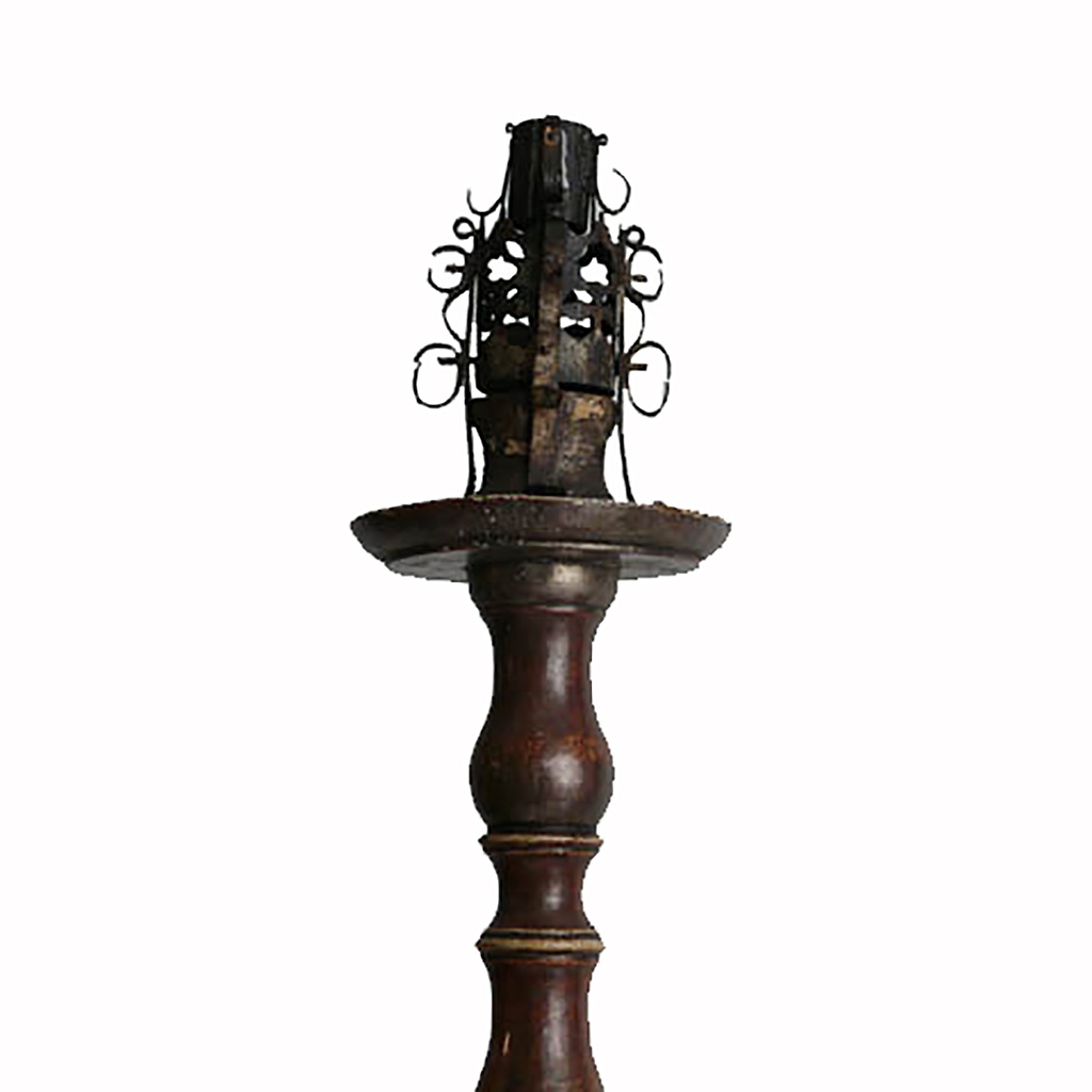 FLEMISH POLYCHROME TORCHERE / CANDLESTICK TURNED STEM ON A TRI FORM BASE WROUGHT IRON CANDLE HOLDER 17TH CENT. 163 CM HIGH (X2)
